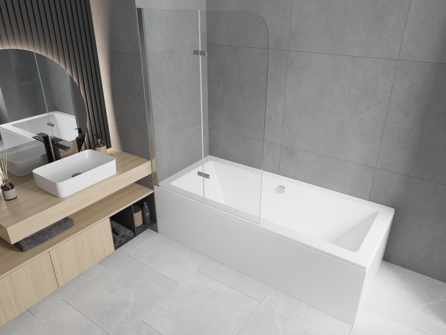 A képernyő két szárnyból készül, a hajtás lehetőségével. Ez a megoldás több helyet takarít meg a fürdőszobában, és lehetővé teszi a fennmaradó hely szabadon történő használatát, ha nem használjuk a fürdőszobát.