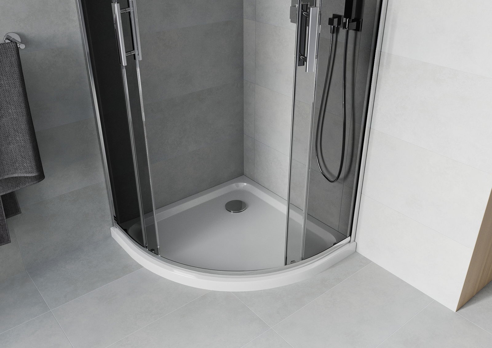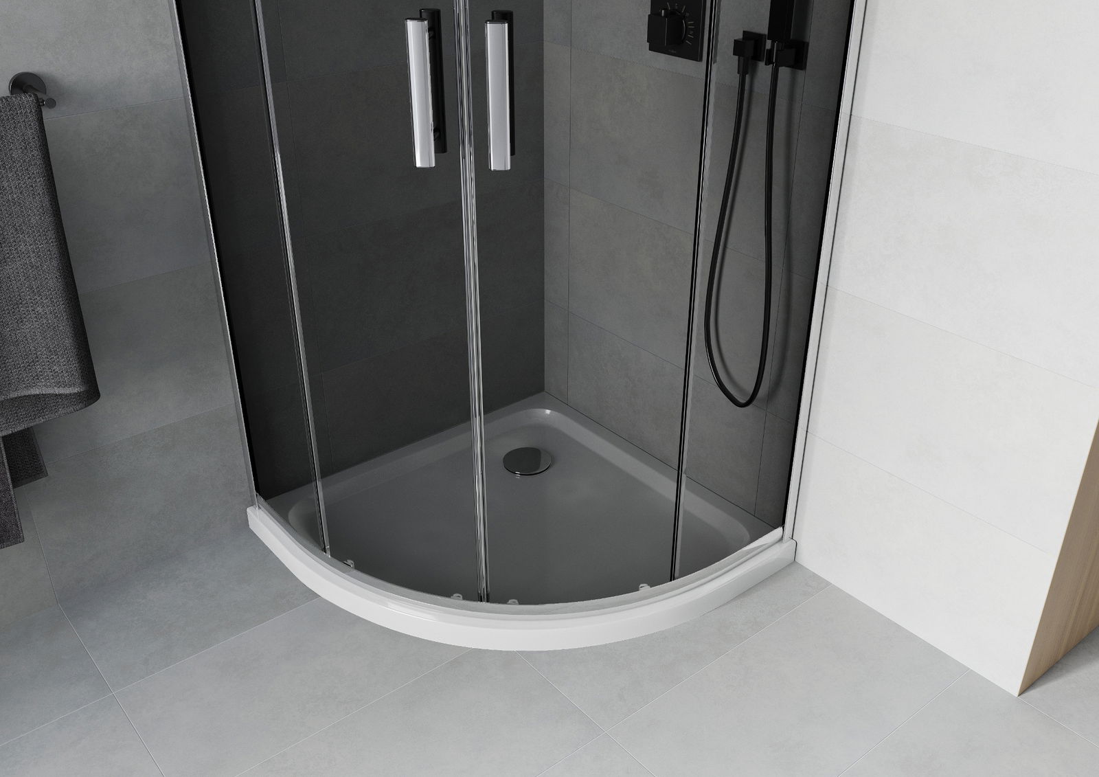 A praktikus és kényelmes fogantyú tartós és ellenálló fémből készült. A divatos forma és a profilok színéhez igazított bevonat modern és stílusos megjelenést ad, hangsúlyozva minden fürdőszoba esztétikáját.