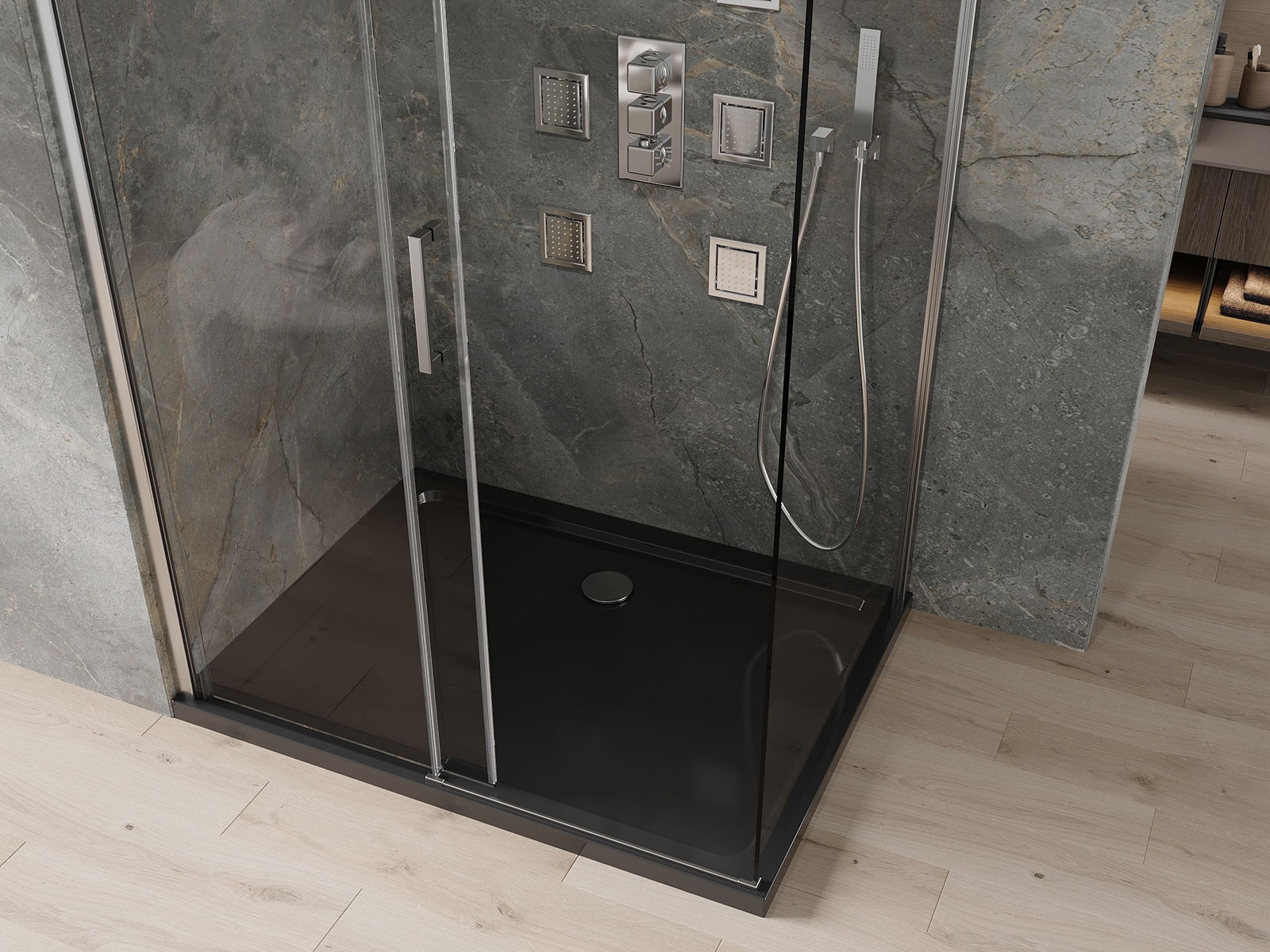 A zuhany tálcának alacsony küszöbértéke van, ami megkönnyíti a belépést és a zuhany elhagyását. Egyedülálló és időtlen kivitelben adja a szobát, így a fürdőszobát kényelmes és esztétikai helyévé teszi a napi relaxációhoz.