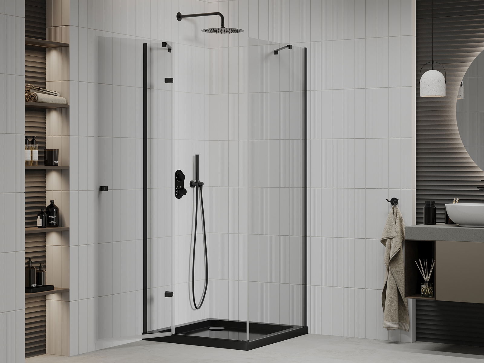 Mexen Roma nyíló zuhanykabin 90 x 90 cm, átlátszó, fekete + Flat tálca, fekete - 854-090-090-70-00-4070B