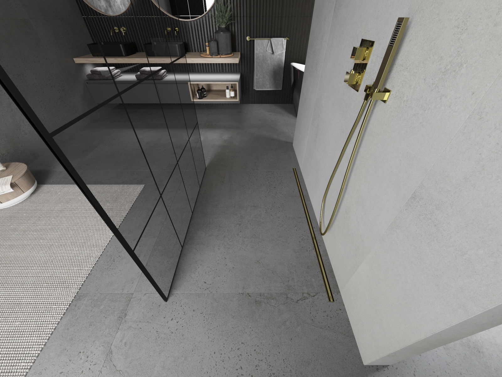 Mexen Kioto szabadon álló zuhanyfal 140 x 200 cm, fekete rács 8 mm, arany - 800-140-002-50-77