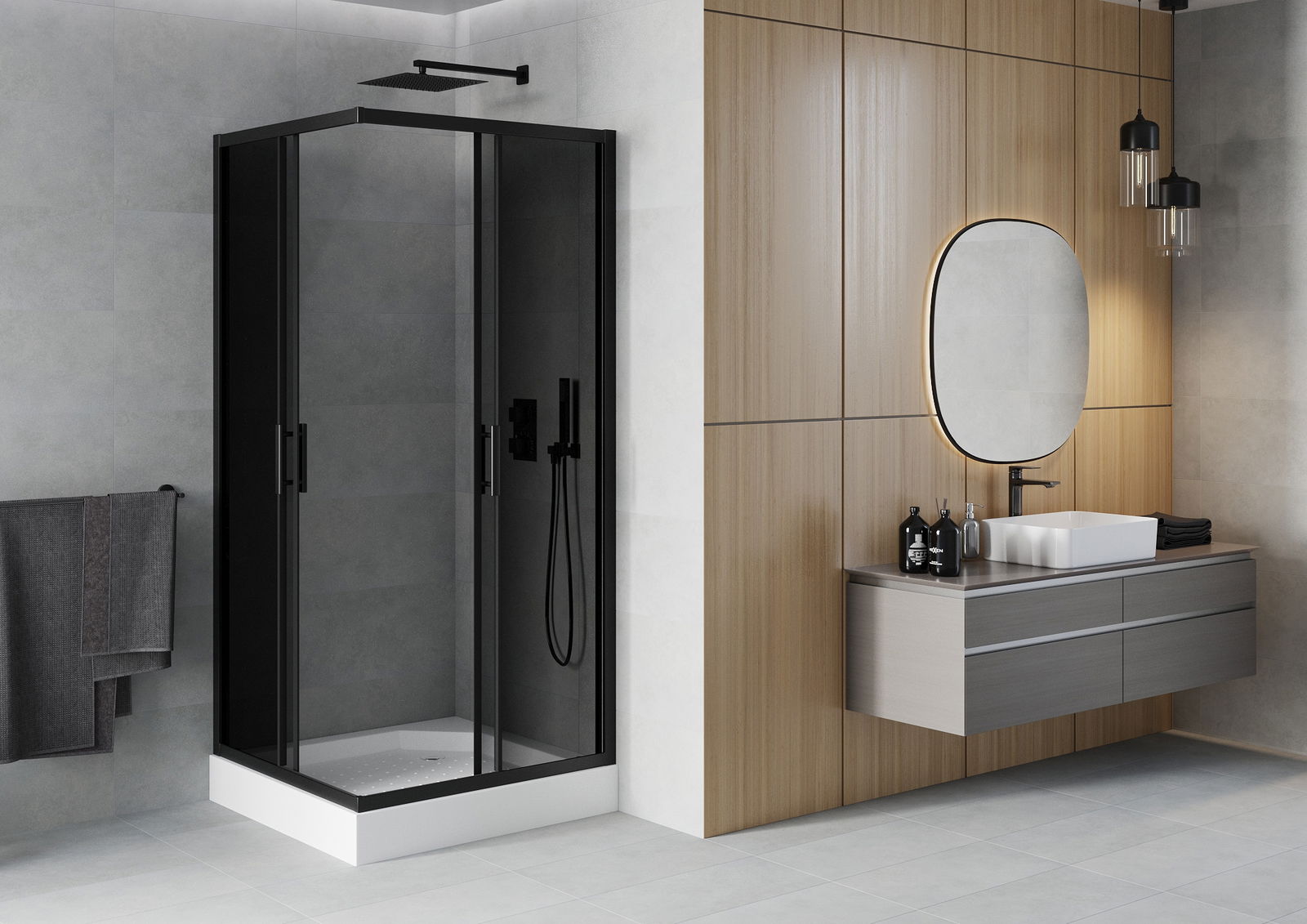 A praktikus és kényelmes fogantyú tartós és ellenálló fémből készült. A divatos forma és a profilok színéhez igazított bevonat modern és stílusos megjelenést ad, hangsúlyozva minden fürdőszoba esztétikáját.