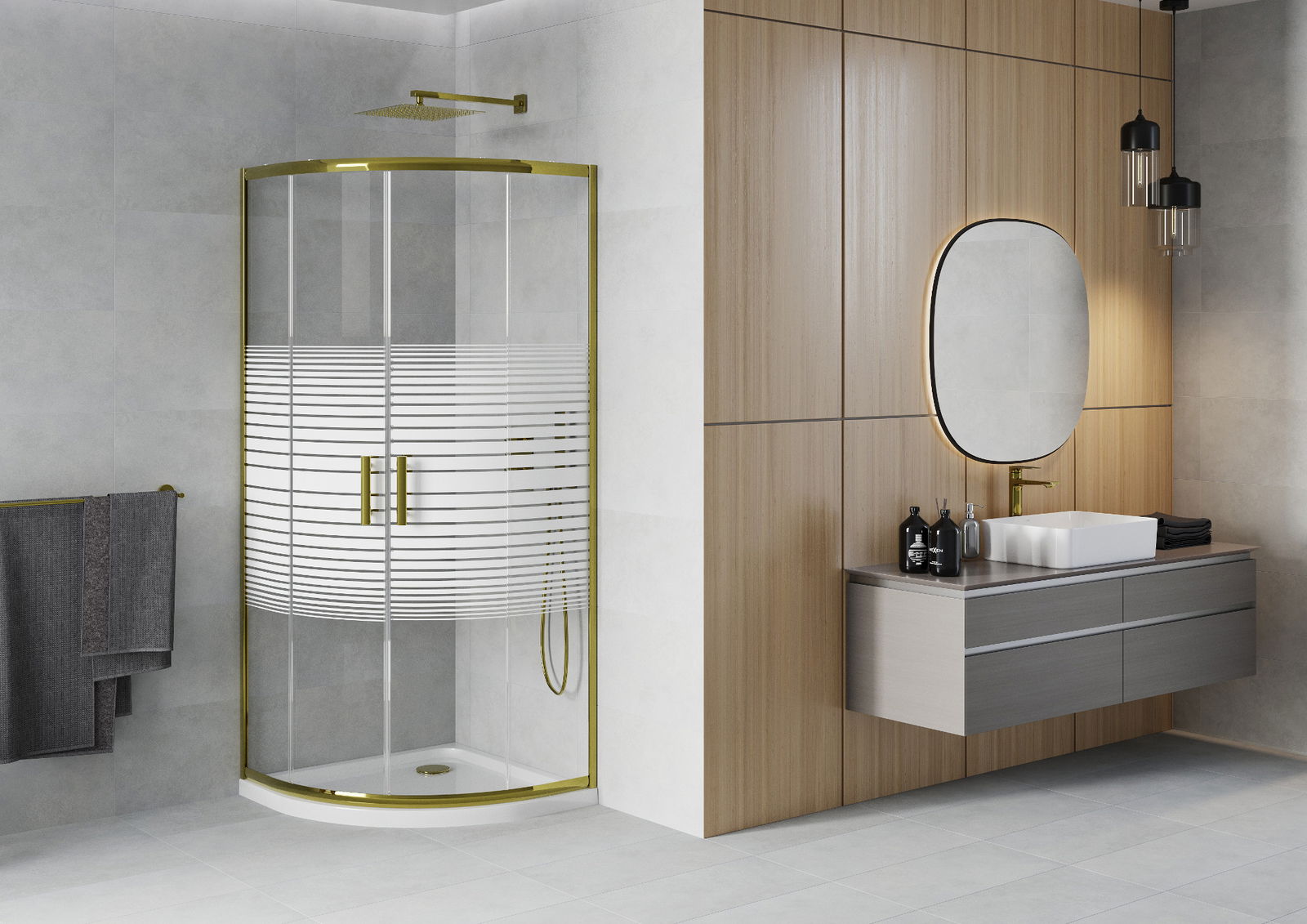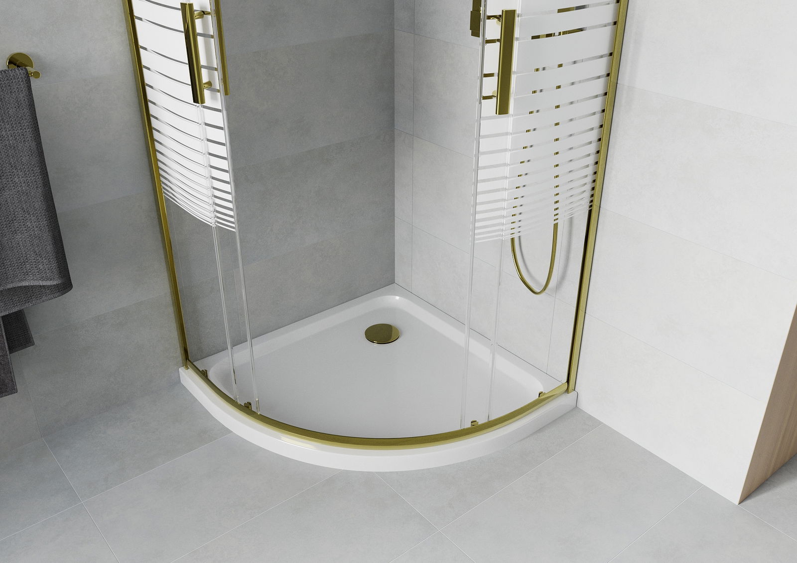 Mexen Rio félköríves zuhanykabin 90 x 90 cm, fehér csíkokkal, arany + Flat zuhanytálca, fehér - 863-090-090-50-20-4110G