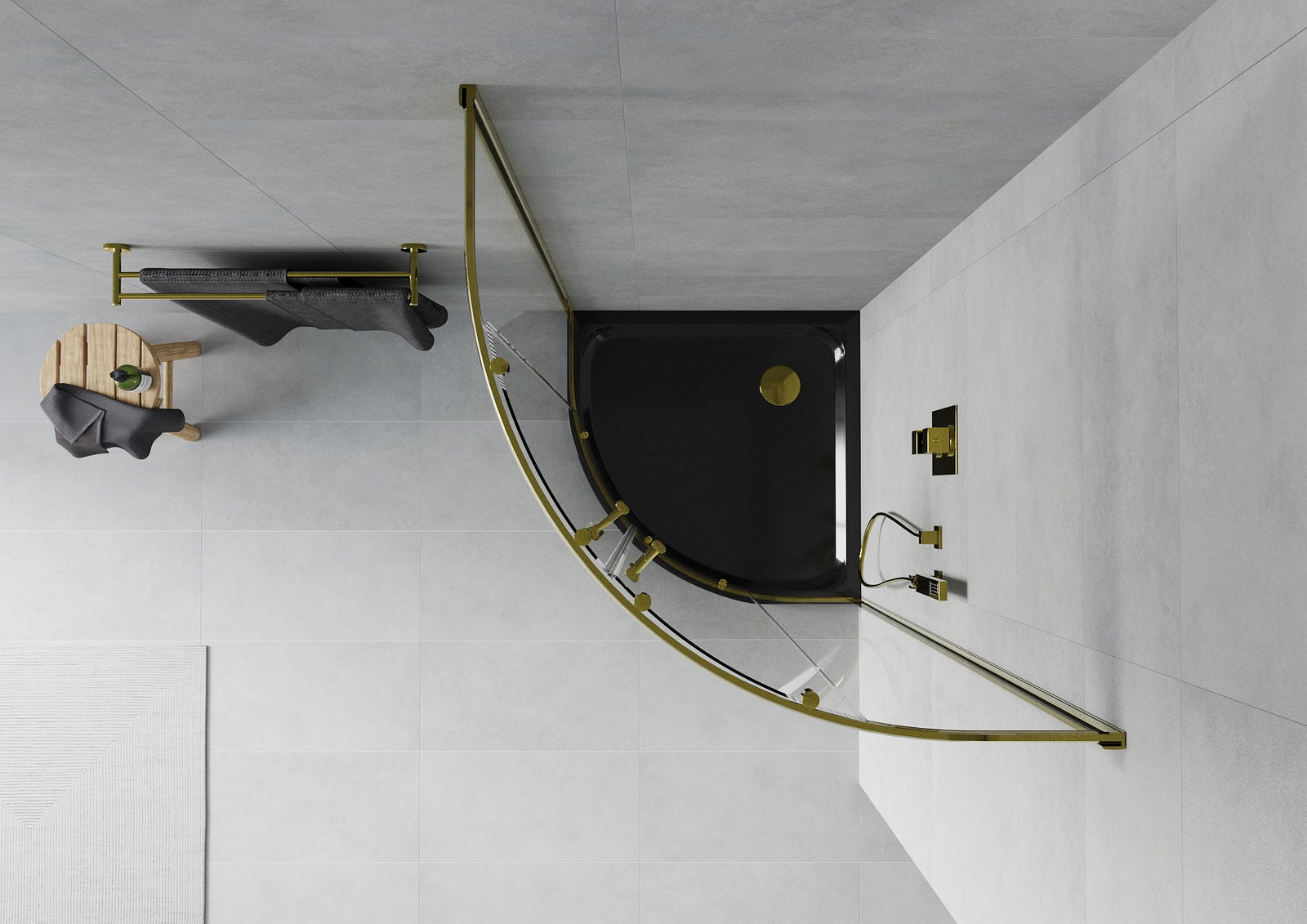 Mexen Rio félkör alakú zuhanykabin 90 x 90 cm, átlátszó, arany + Flat zuhanytálca, fekete - 863-090-090-50-00-4170G