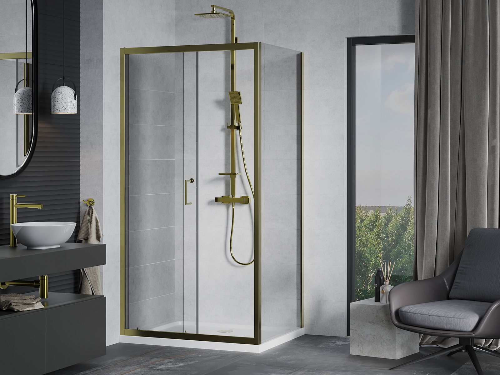 Mexen Apia tolóajtós zuhanykabin 90 x 80 cm, áttetsző, arany + Flat zuhanytálca, fehér - 840-090-080-50-00-4010G