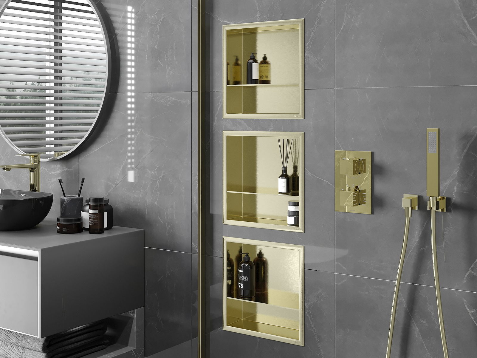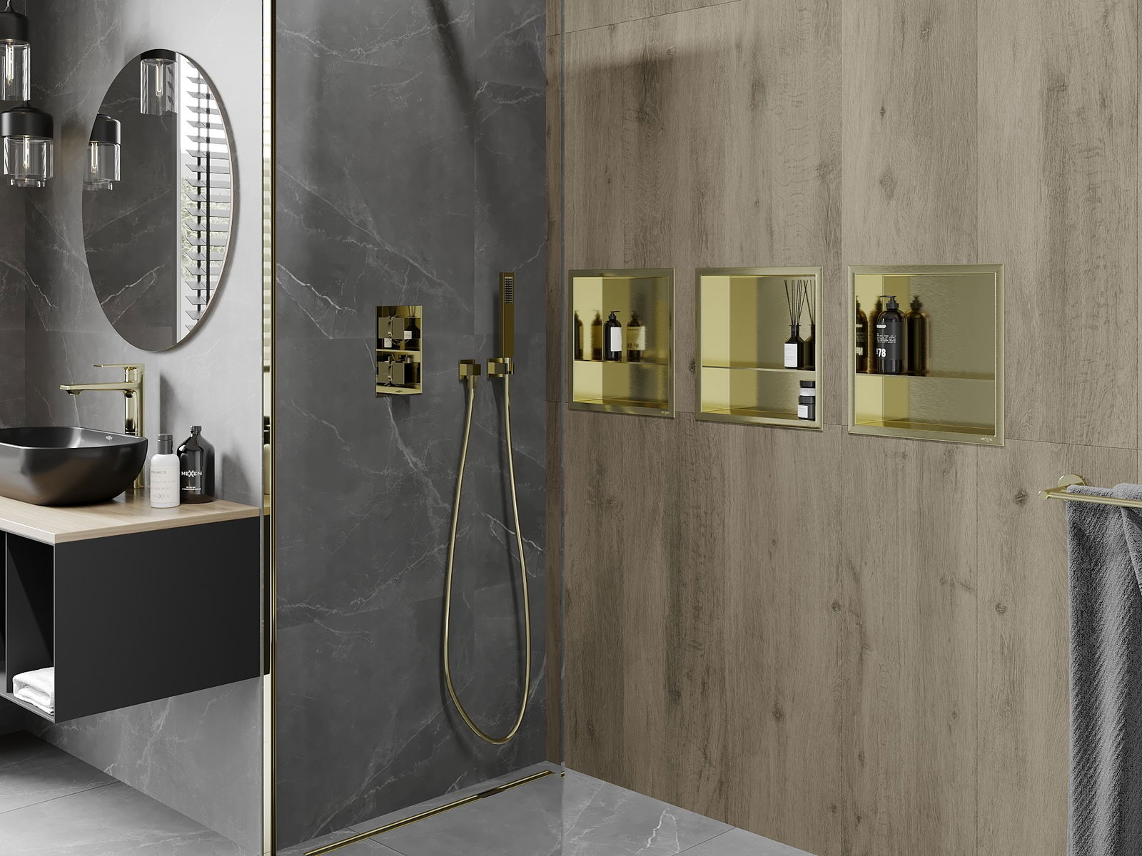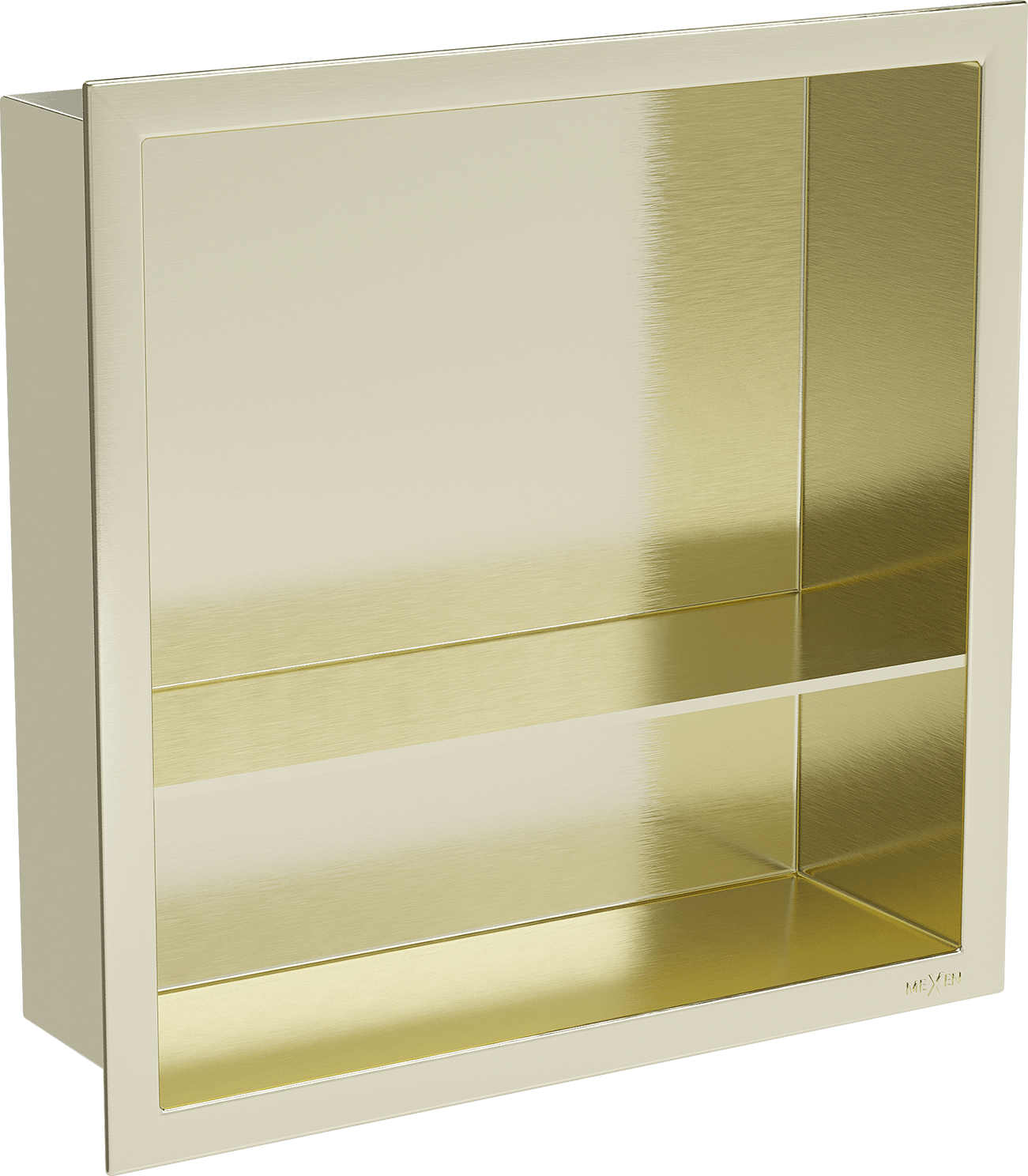 Mexen X-Wall-R 30 x 30 cm-es peremes és polcos beépíthető polc, arany szálcsiszolt - 1950303010S