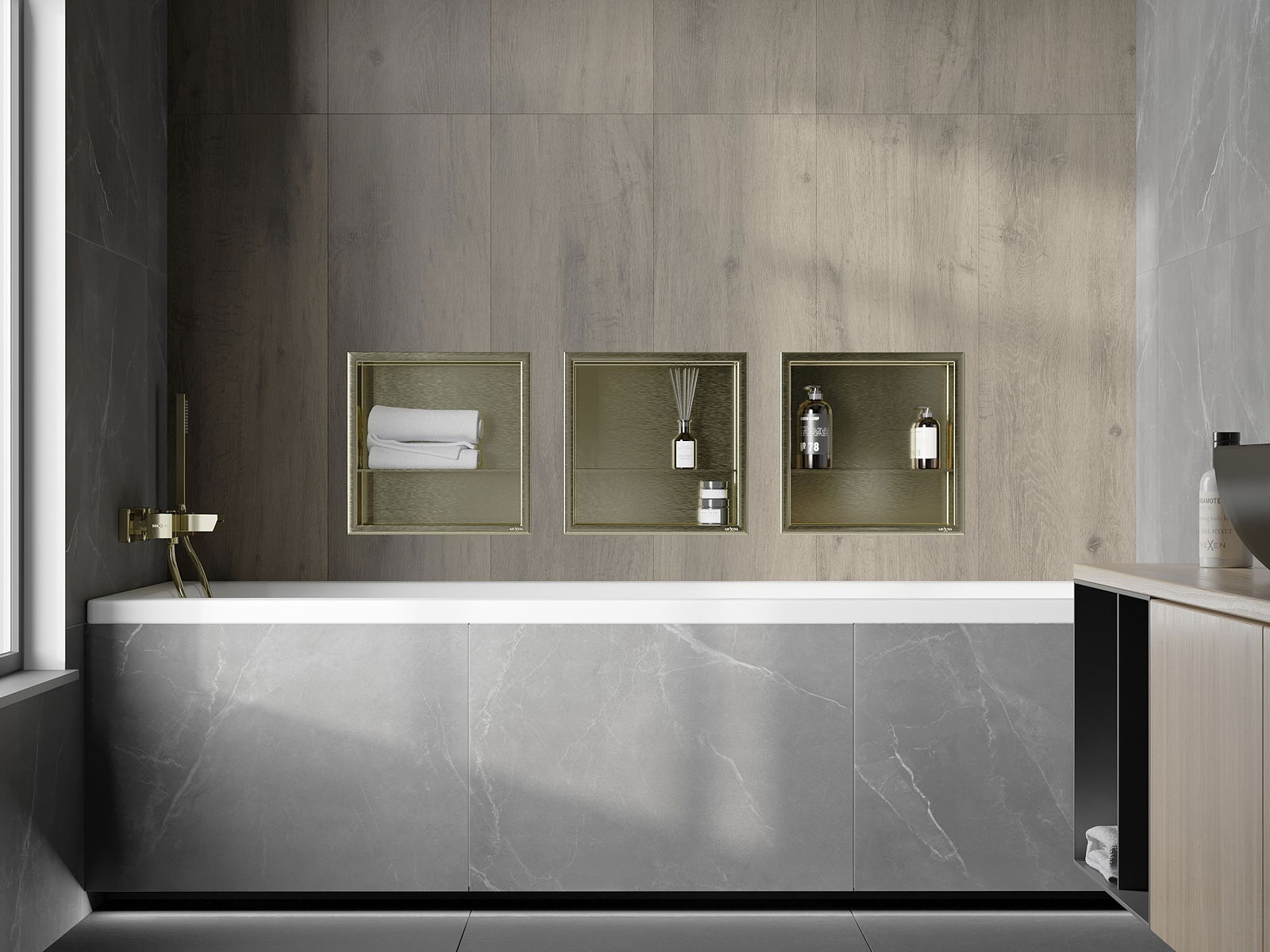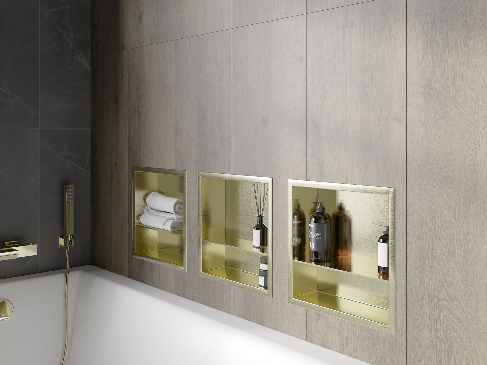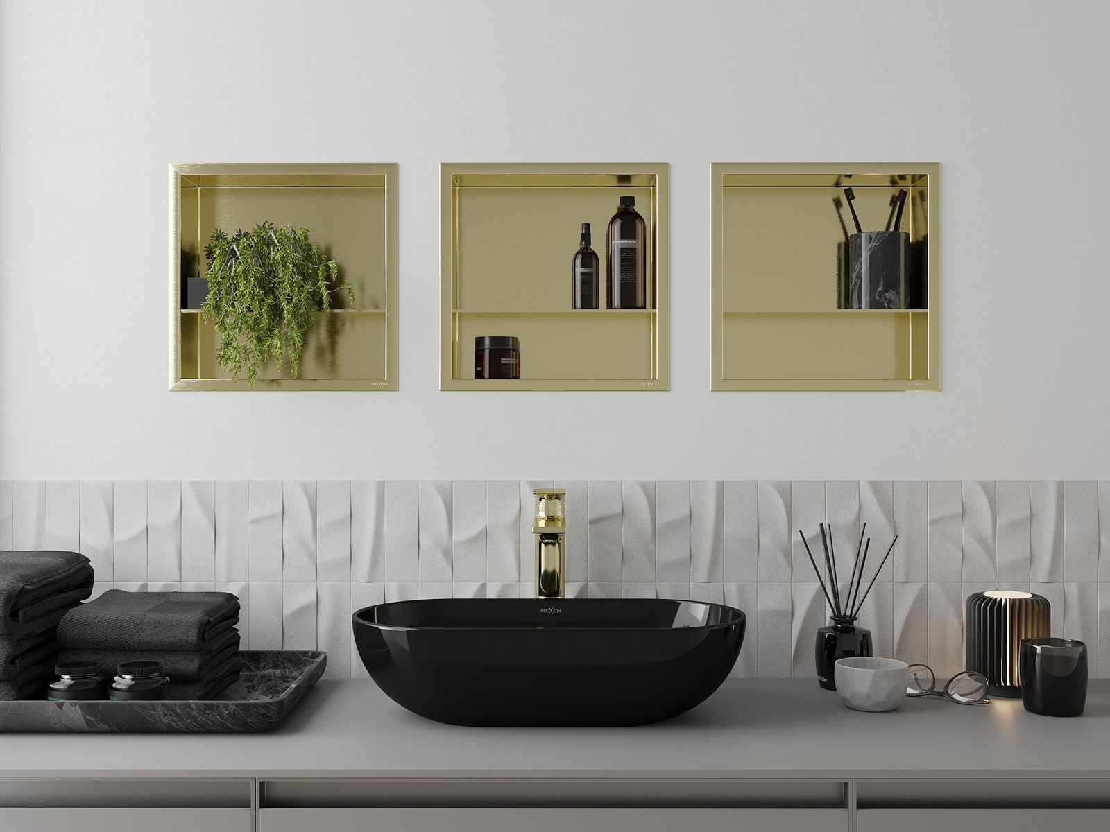 Mexen X-Wall-R 30 x 30 cm-es peremes és polcos beépíthető polc, arany szálcsiszolt - 1950303010S