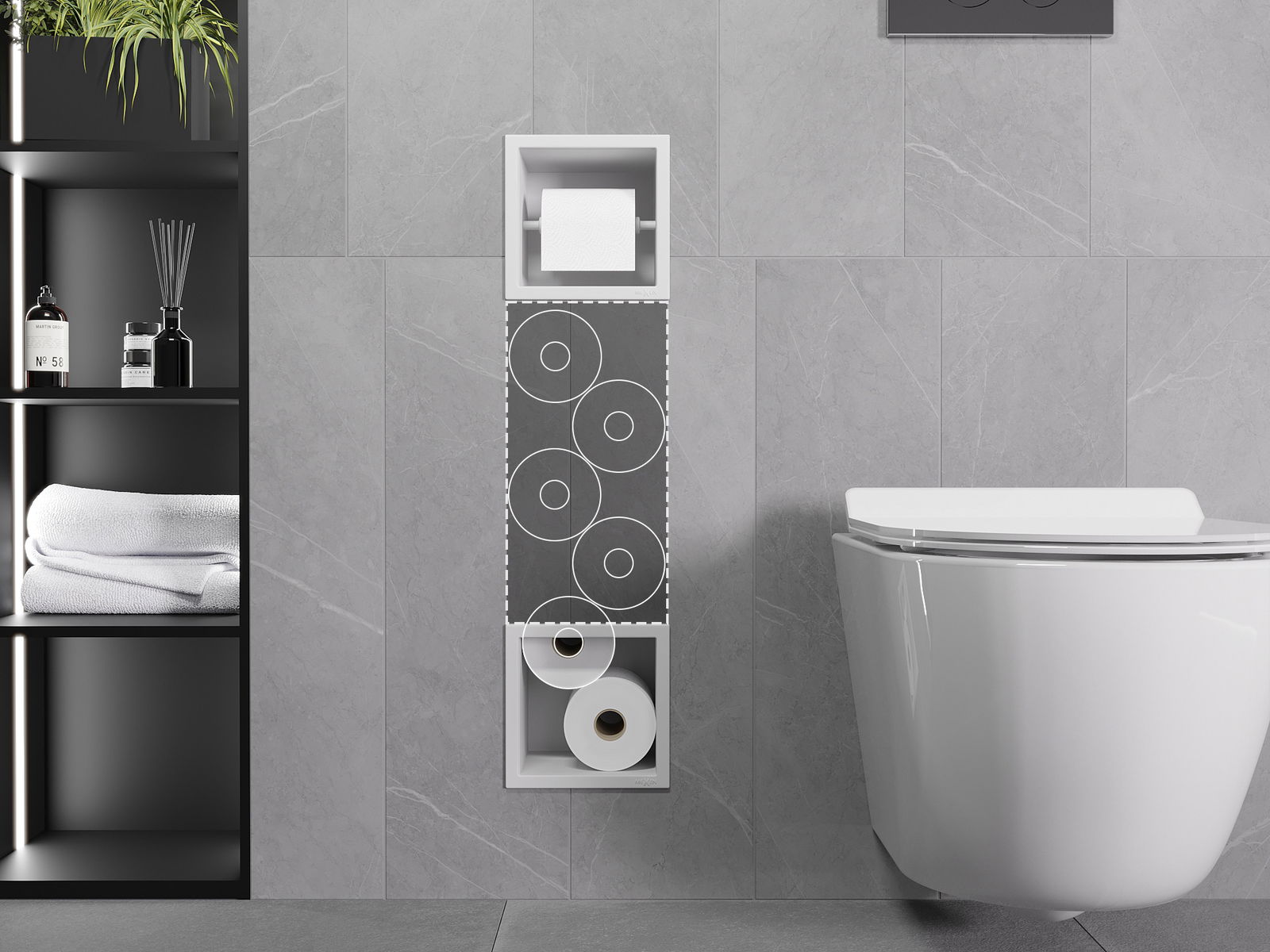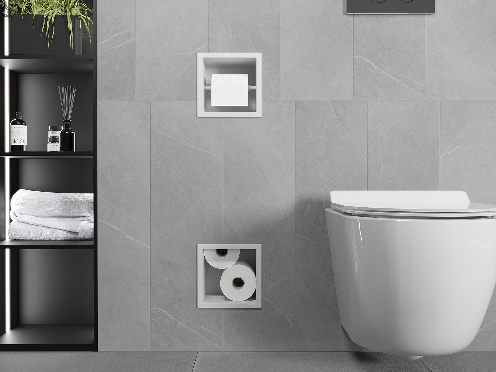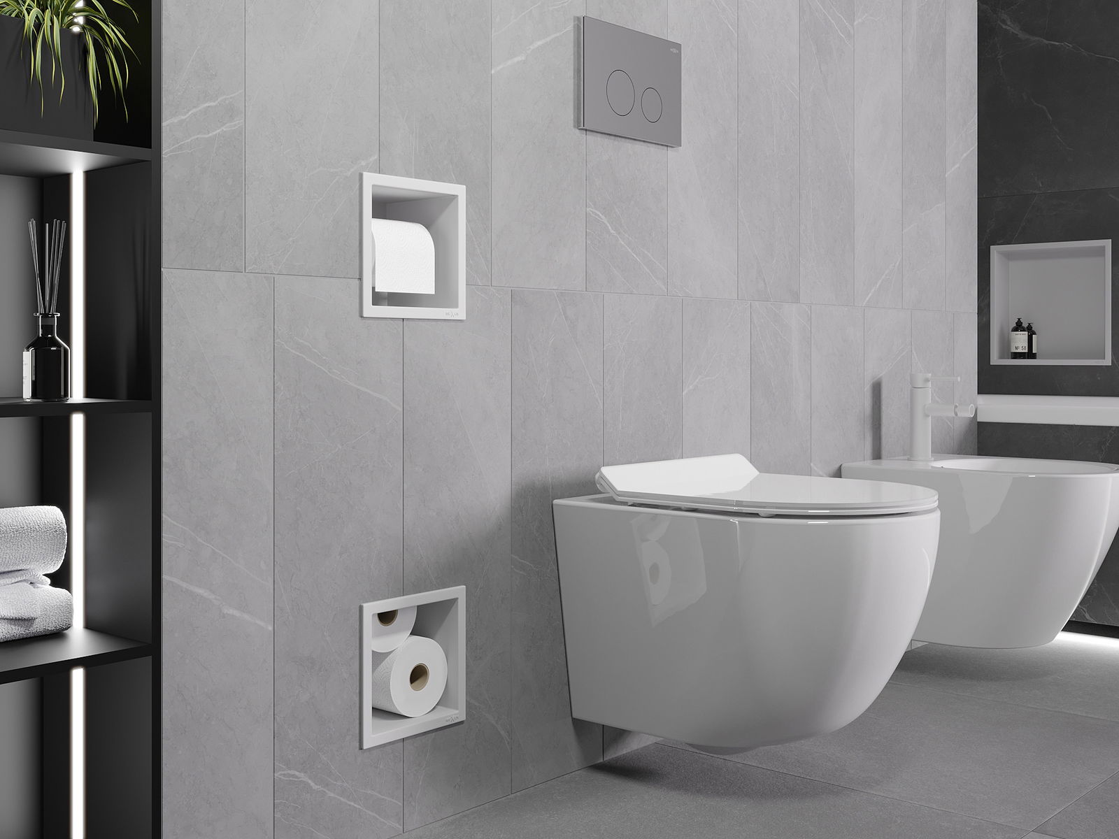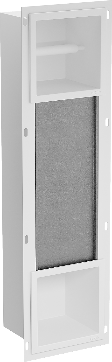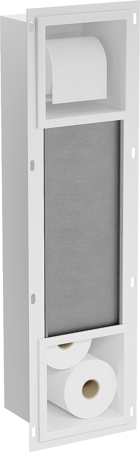 Az X-wall egy praktikus WC-papír tartó, beépített fali tárolóval. Az új tekercs mindig kéznél van, és a korábban WC-papír tárolására kijelölt helyet más módon is kihasználhatjuk.
