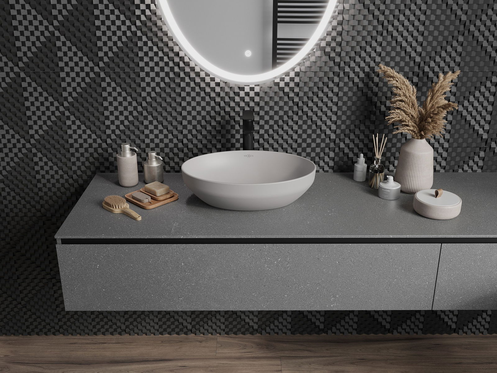 A kerámia matt felülete tökéletesen hangsúlyozza a termék színének természetét, így egyedi és kifejező felületet biztosít. A matt kerámia finom szerkezete eleganciát vezet be a fürdőszobában, esztétikai teret teremtve.
