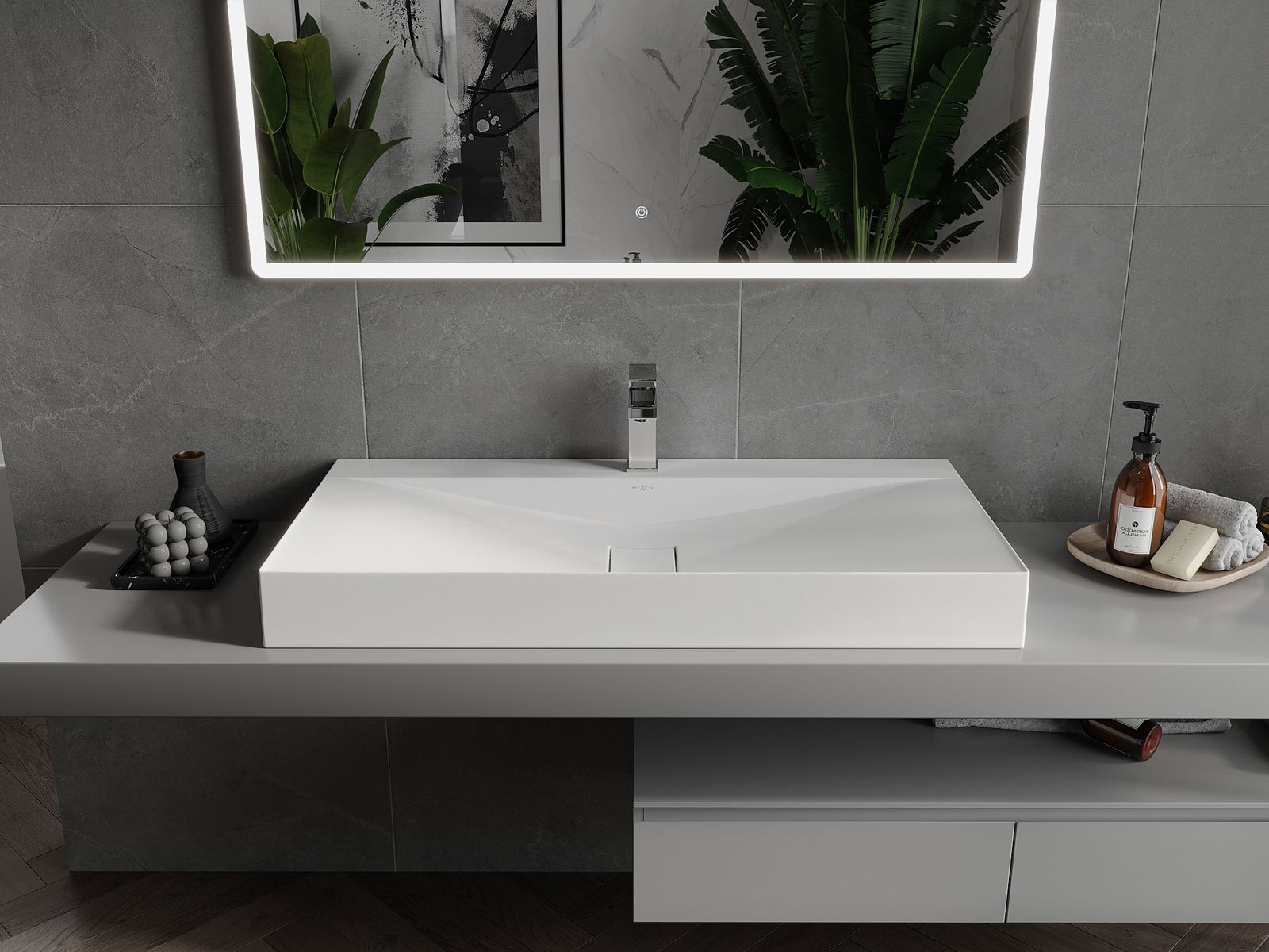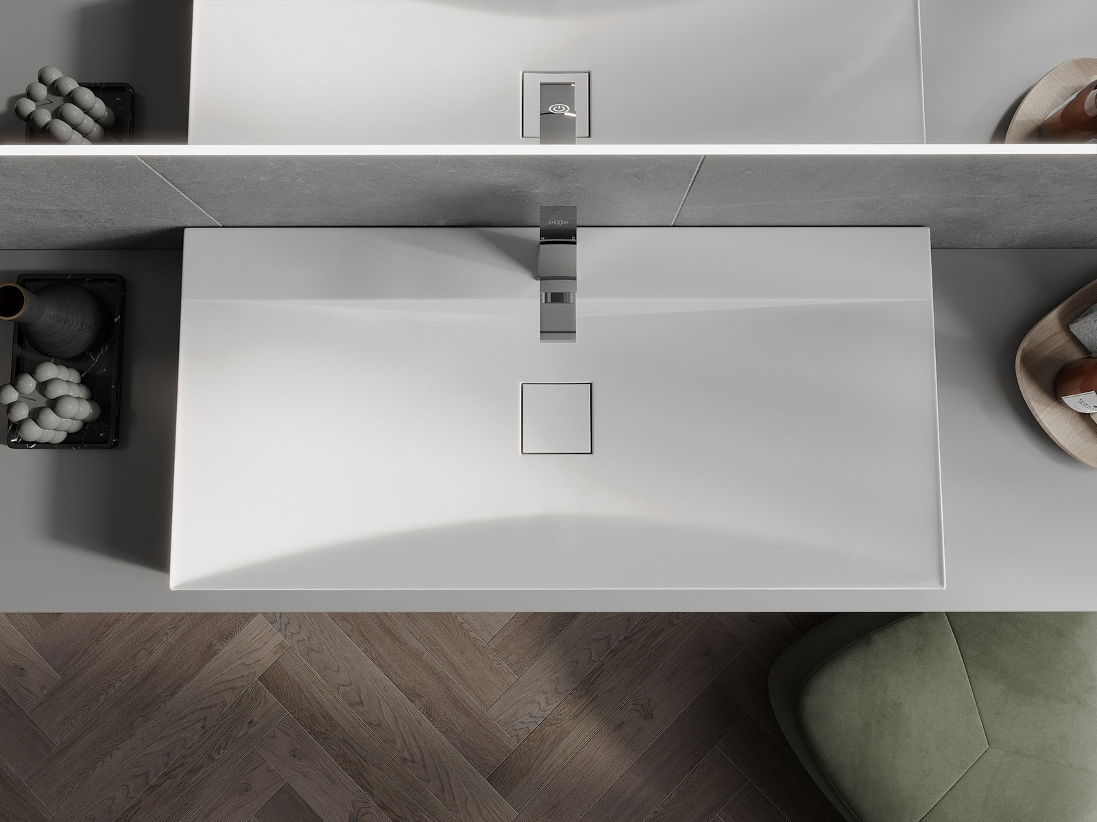 A mosogatónak van egy lyuk, amelybe fel tudjuk szerelni az akkumulátort. Ez értékes helyet takarít meg a fürdőszobában, és hangsúlyozza annak esztétikáját. Ez a megoldás lehetővé teszi, hogy könnyen tisztán tartsa a mosogatót.