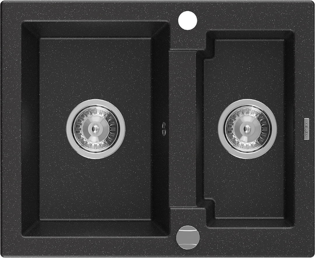 Mexen Carlos gránit mosogató 1,5 medencés 582 x 475 mm, fekete/ezüst metál, króm szifon - 6518581500-73