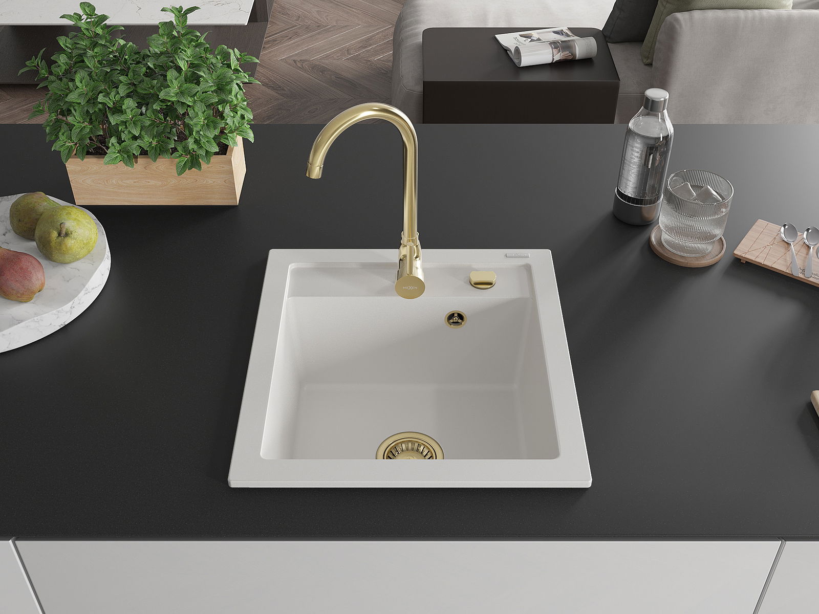 A mosogató kiváló minőségű gránitból készül. Ez egy elegáns és mindenekelőtt minden konyhához praktikus kiegészítés, stílusától függetlenül. A kiváló minőségű és a gránit tartósság biztosítja a sok éves használatát.