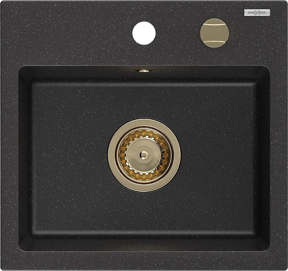 Mexen Milo egykamrás gránit mosogató 435 x 410 mm, fekete/ezüst metál, arany szifon - 6505441000-73-G