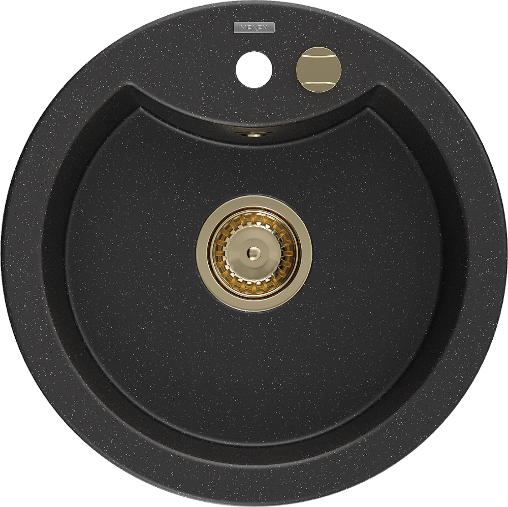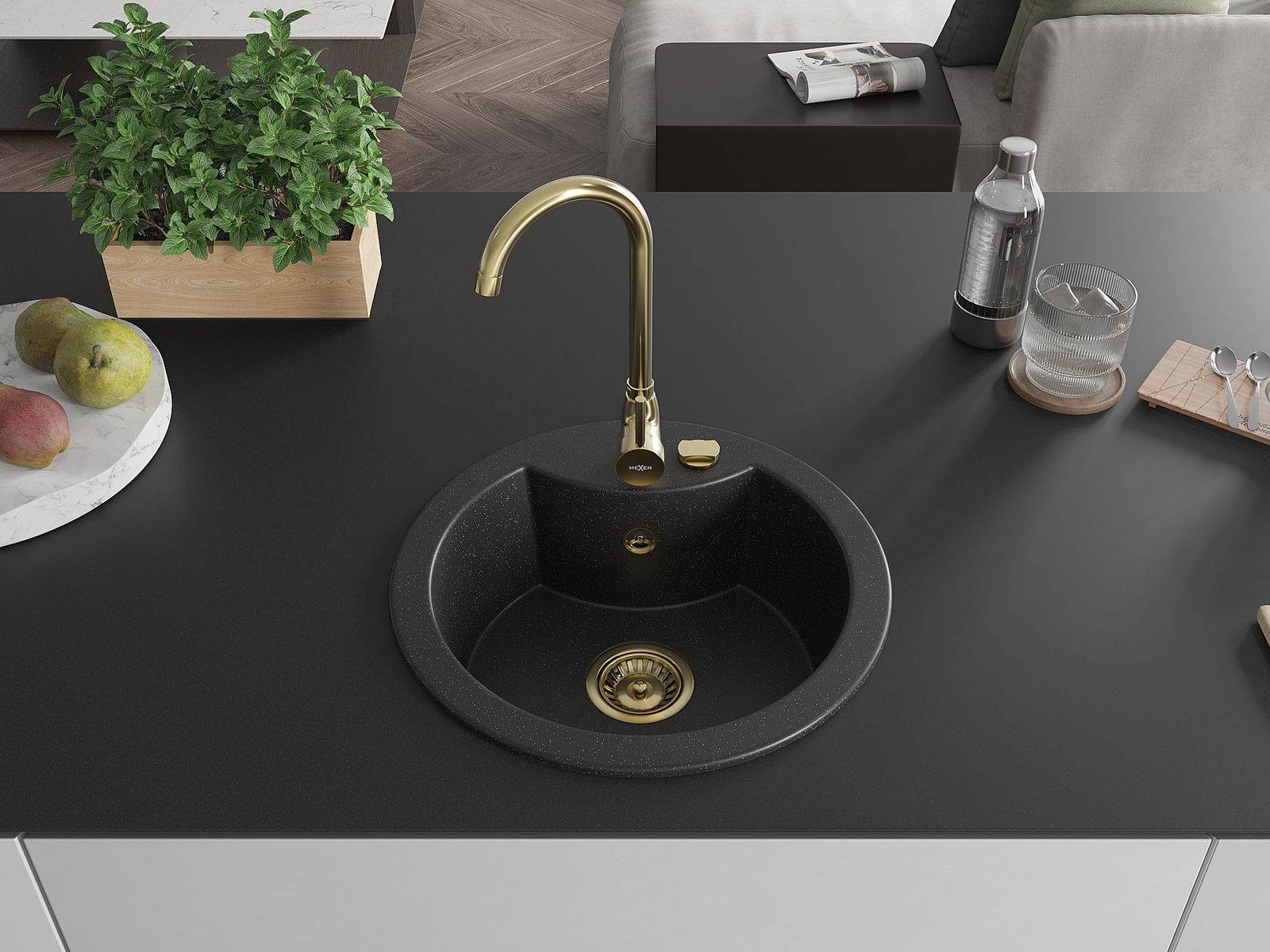 Mexen Diego 1-medencés gránit mosogató 488 x 480 mm, fekete/ezüst metál, arany szifon - 6512481000-73-G