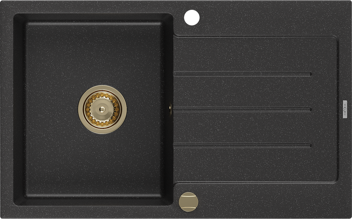 Mexen Bruno gránit mosogató 1-medencés csepegtetővel 795 x 495 mm, fekete/ezüst metál, arany szifon - 6513791010-73-G
