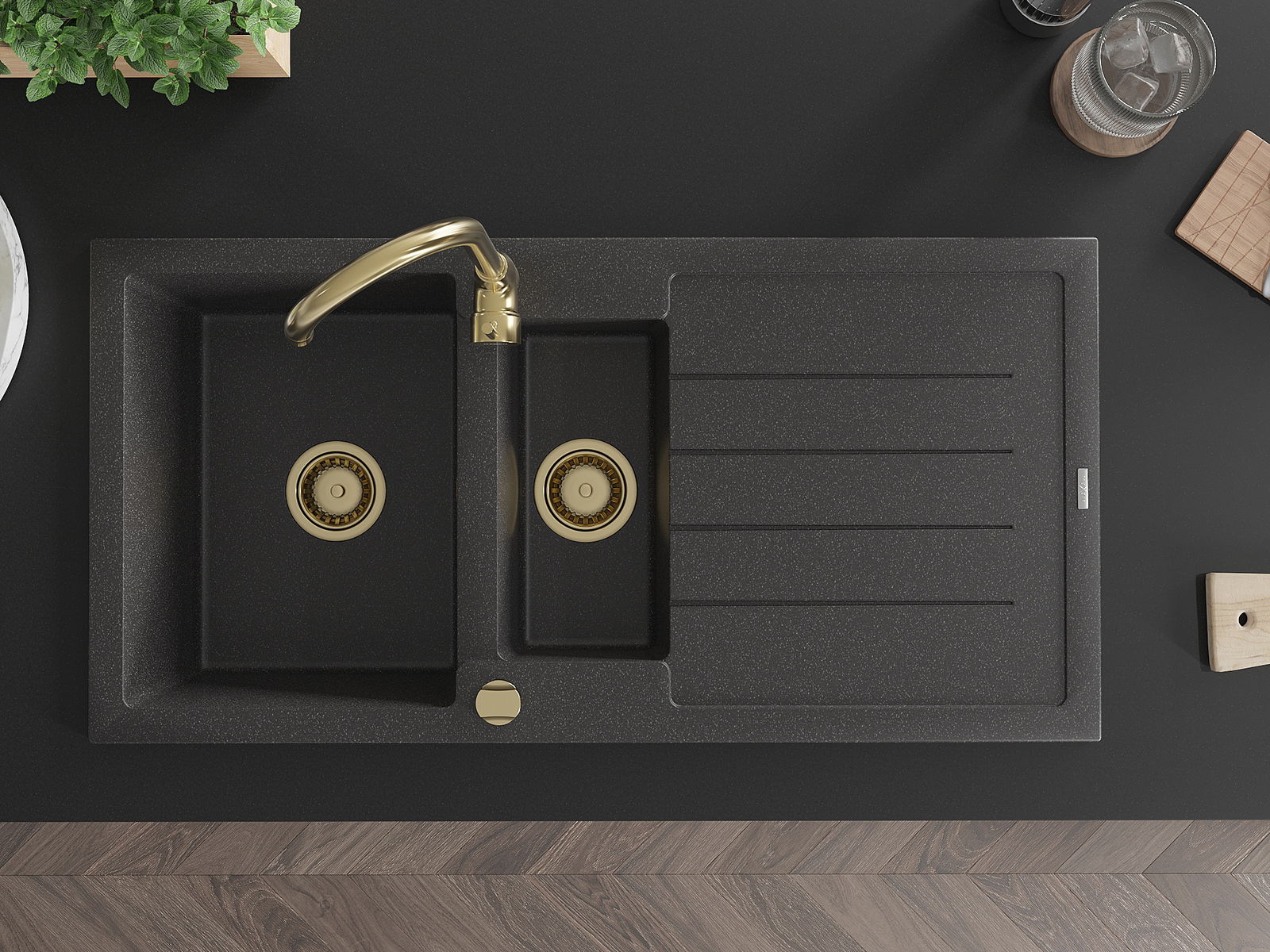 A mosogató 2 összekapcsolt lyukkal rendelkezik, amelynek átmérője 35 mm, önmagában. Felhasználhatók többek között Olyan folyékony adagoló rögzítéséhez, amely kiküszöböli a műanyag palackok jelenlétét a konyhában, és elegáns kivitelben adja meg.