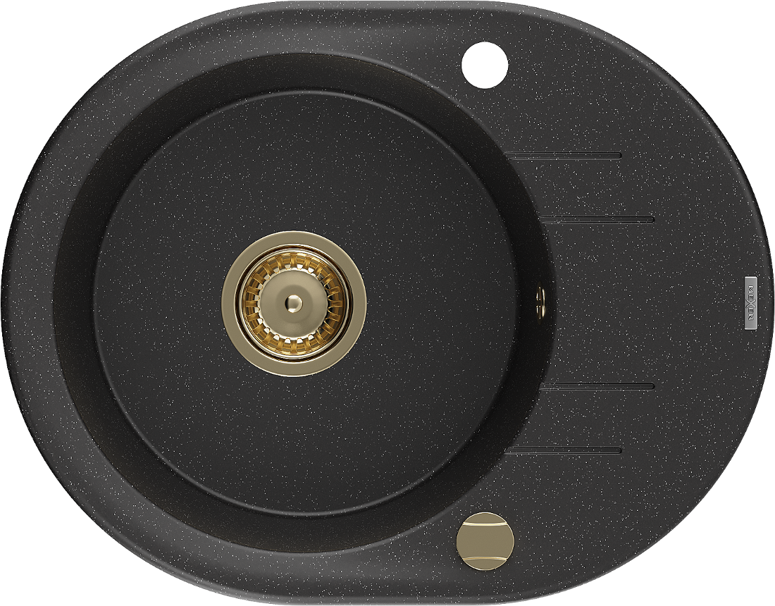 Mexen Kevin gránit mosogató 1-medencés csepegtetővel 586 x 458 mm, fekete/ezüst metálik, arany szifonnal - 6517581005-73-G