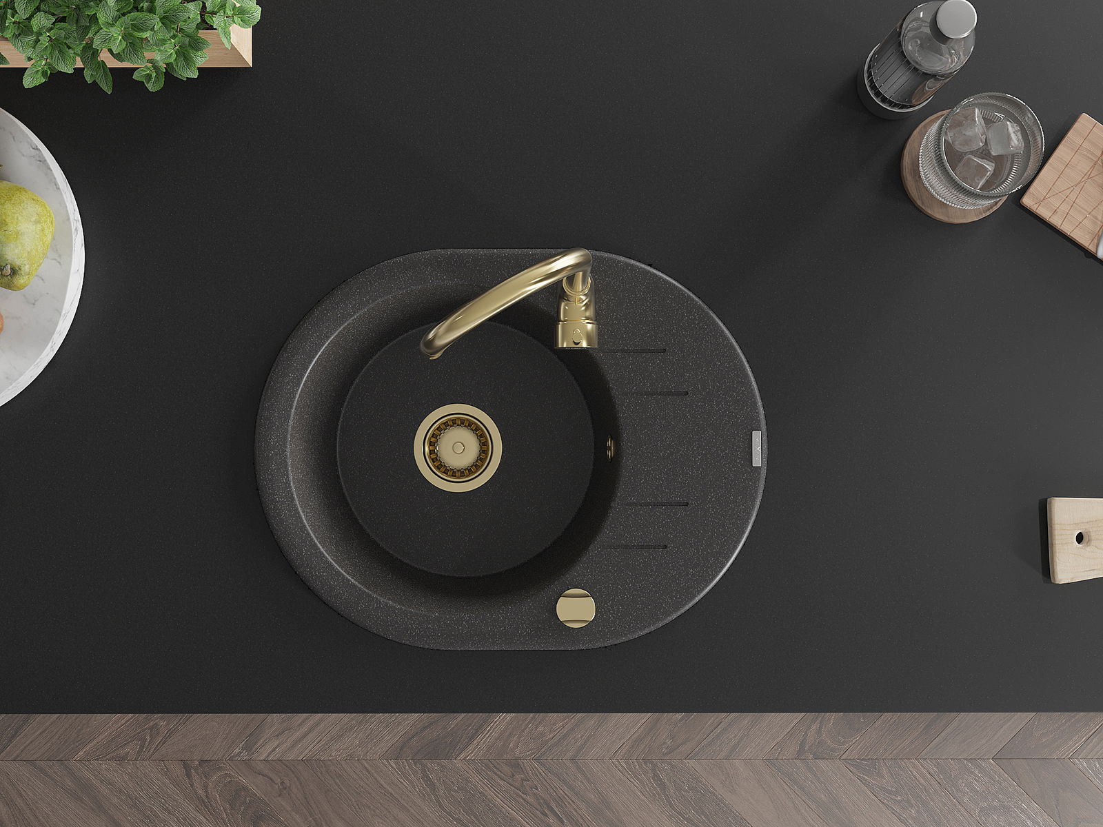 Mexen Kevin egymedencés gránit mosogató csepegtetővel 586 x 458 mm, fekete pettyes, arany szifonnal - 6517581005-76-G