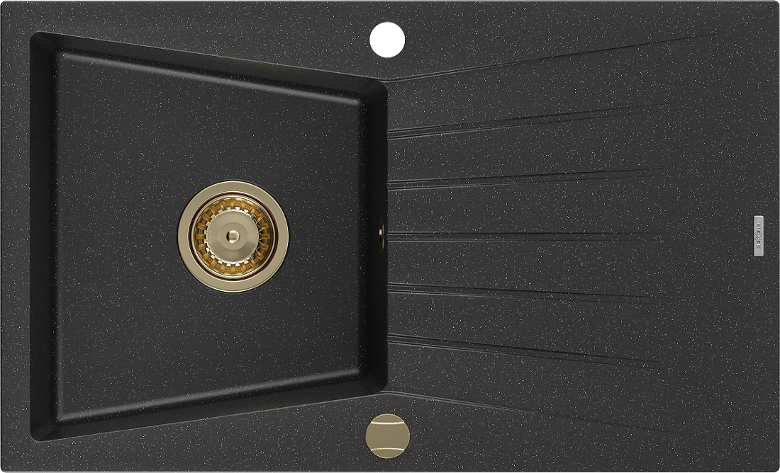 Mexen Cesar egymedencés gránit mosogató lefolyóval, 775 x 470 mm, fekete/ezüst metál, arany szifon - 6514771010-73-G