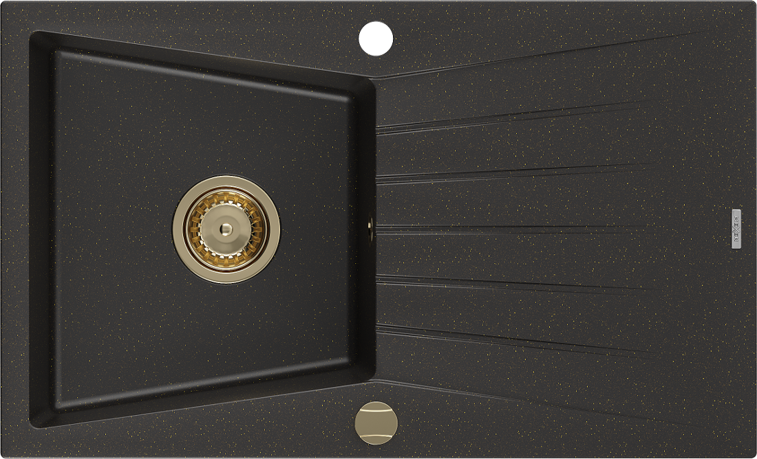 Mexen Cesar egymedencés gránit mosogató csepegtetővel 775 x 470 mm, fekete/arany metál, arany szifonnal - 6514771010-75-G