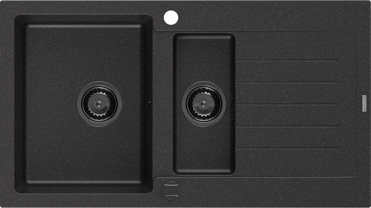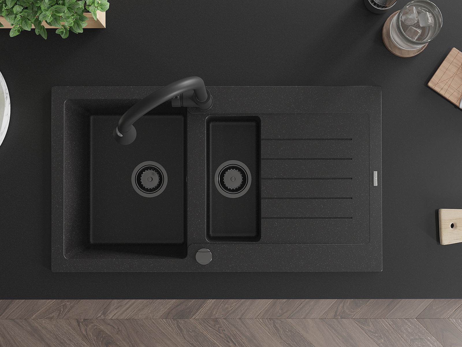 Mexen Matias gránit mosogató 1,5-medencés csepegtetővel 900 x 505 mm fekete/ezüst metál, fekete szifon - 6502901505-73-B