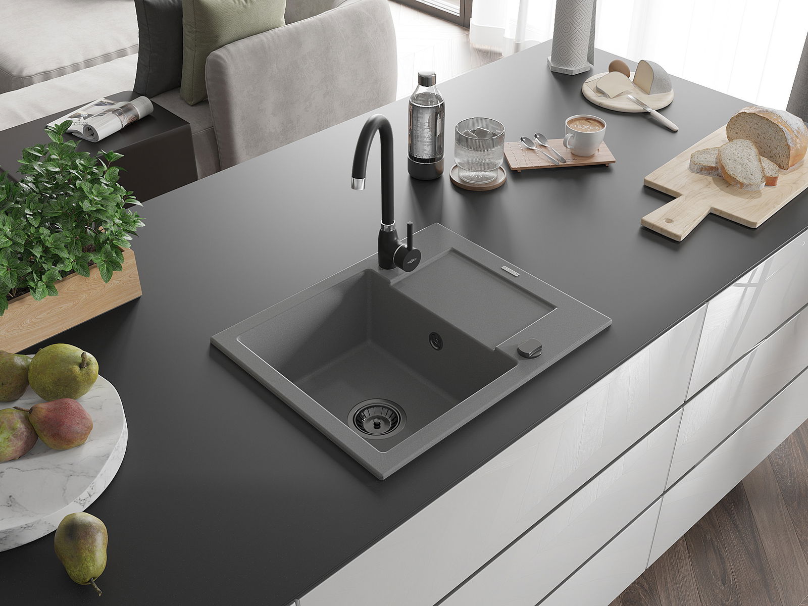 A mosogató kiváló minőségű gránitból készül. Ez egy elegáns és mindenekelőtt minden konyhához praktikus kiegészítés, stílusától függetlenül. A kiváló minőségű és a gránit tartósság biztosítja a sok éves használatát.