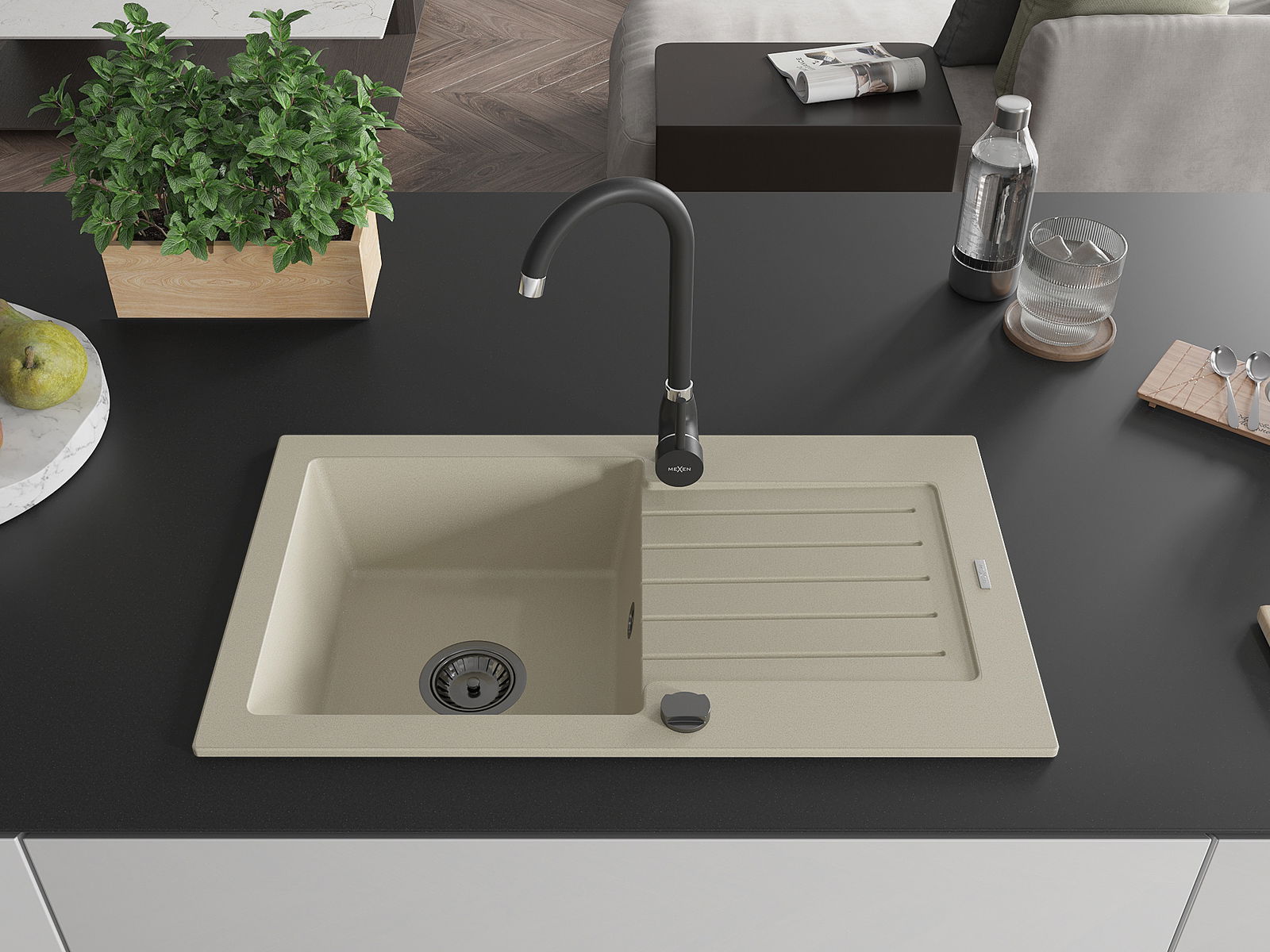 A mosogató kiváló minőségű gránitból készül. Ez egy elegáns és mindenekelőtt minden konyhához praktikus kiegészítés, stílusától függetlenül. A kiváló minőségű és a gránit tartósság biztosítja a sok éves használatát.