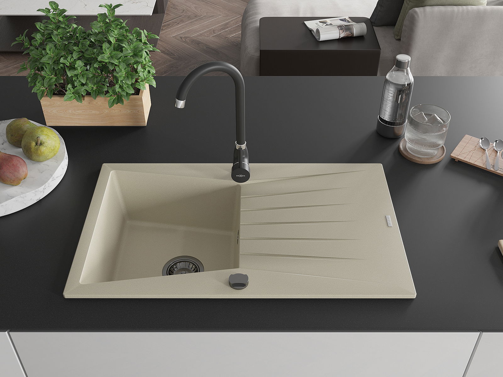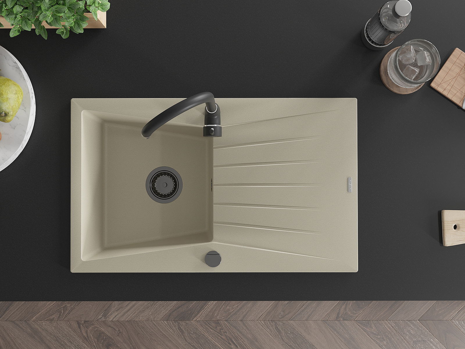 A mosogató kiváló minőségű gránitból készül. Ez egy elegáns és mindenekelőtt minden konyhához praktikus kiegészítés, stílusától függetlenül. A kiváló minőségű és a gránit tartósság biztosítja a sok éves használatát.