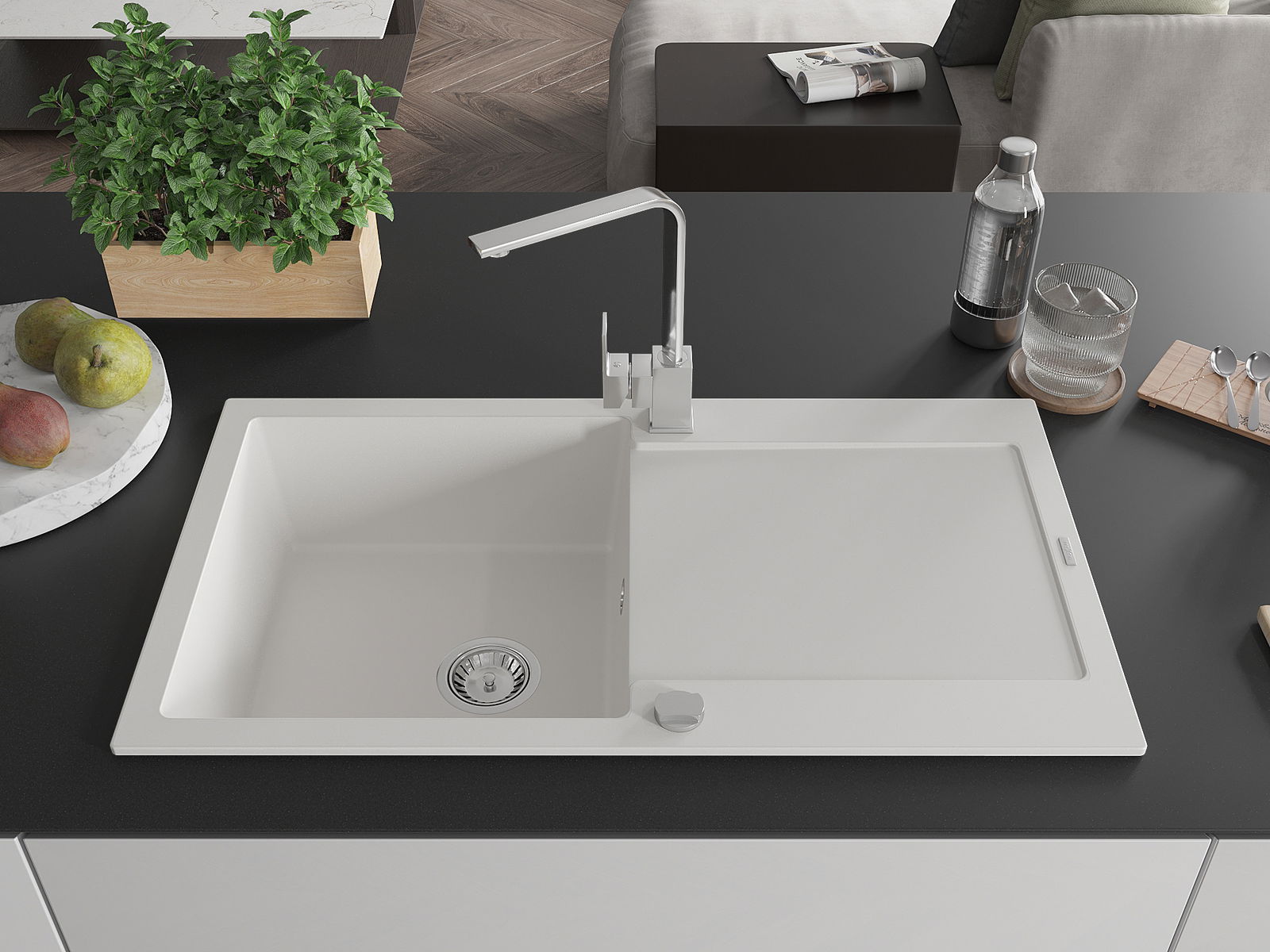 Mexen Leo egymedencés gránit mosogató csöpögtetővel és Rita konyhai csapteleppel, fehér - 6501-20-670300-00