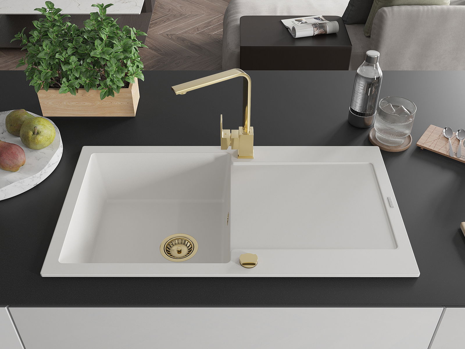 A mosogató kiváló minőségű gránitból készül. Ez egy elegáns és mindenekelőtt minden konyhához praktikus kiegészítés, stílusától függetlenül. A kiváló minőségű és a gránit tartósság biztosítja a sok éves használatát.