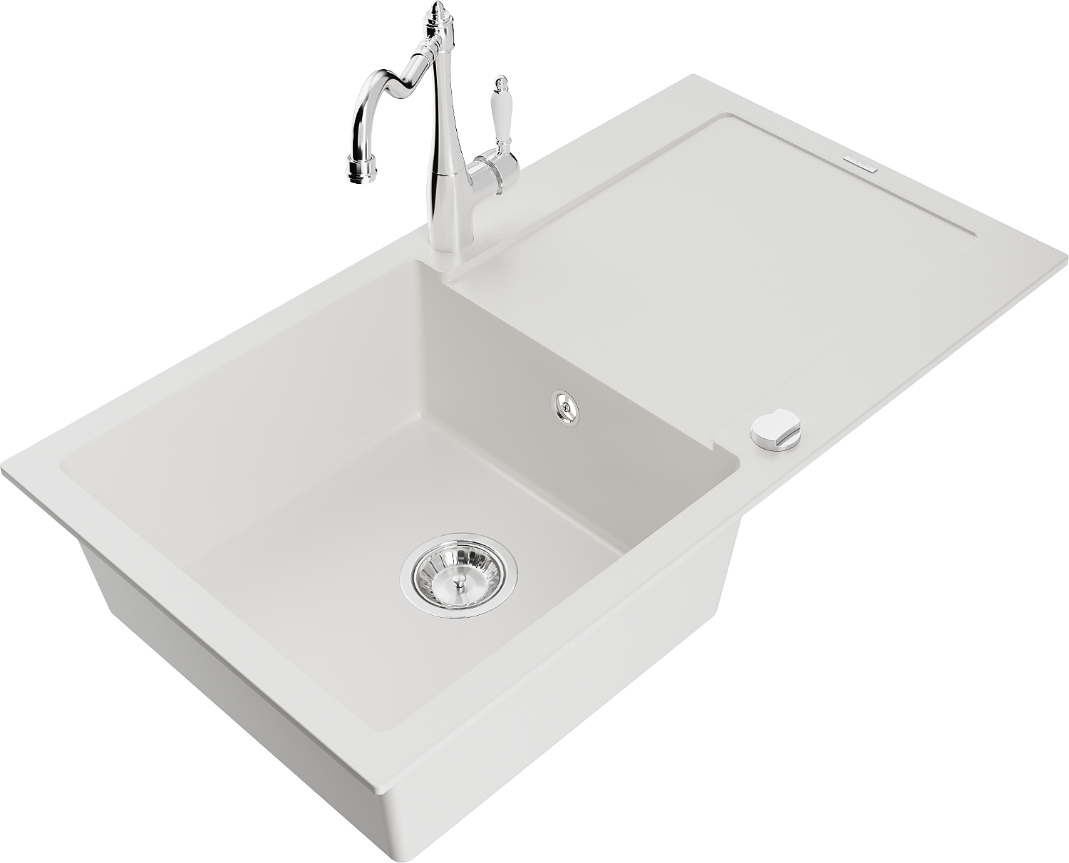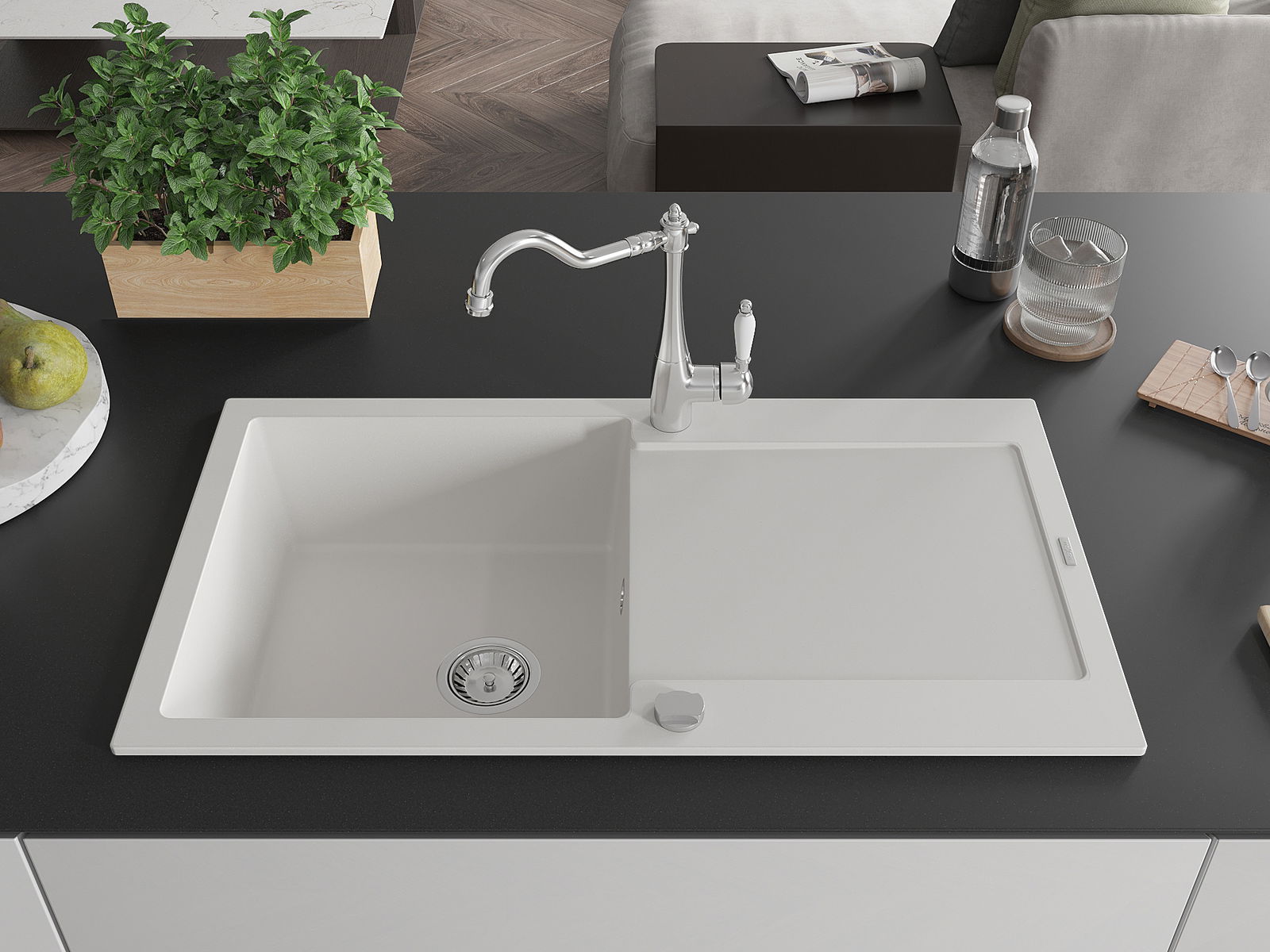 Mexen Leo egymedencés gránit mosogató elvezetővel és Carla konyhai csapteleppel, fehér - 6501-20-670700-00