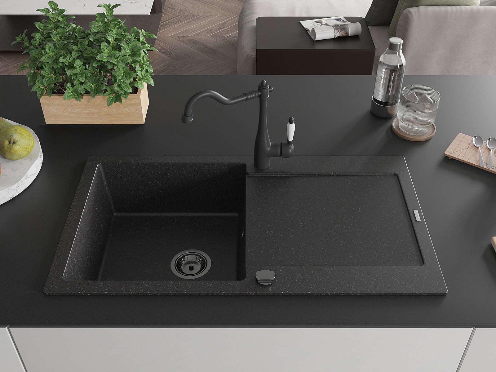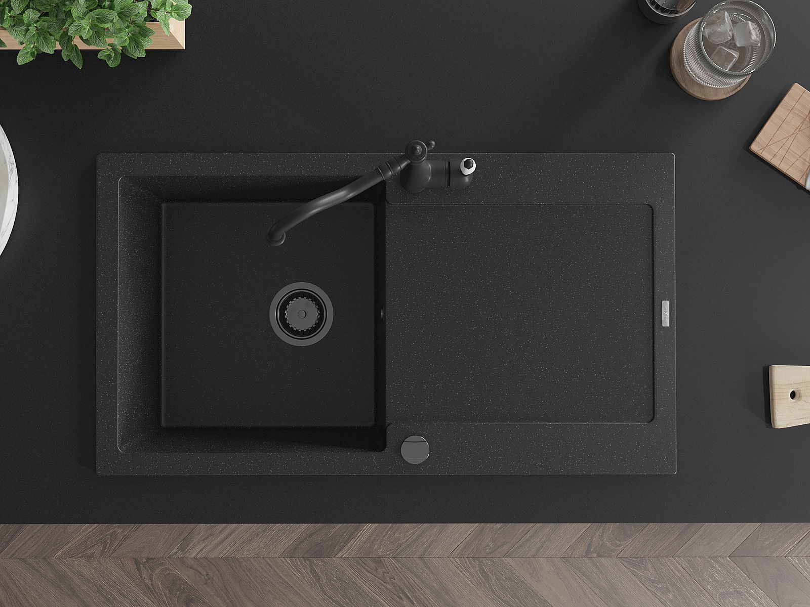 A mosogató magas minőségű gránitból készült. Elegáns, de mindenekelőtt praktikus kiegészítője minden konyhának, függetlenül annak stílusától. A gránit magas minősége és tartóssága hosszú távú használatot biztosít.