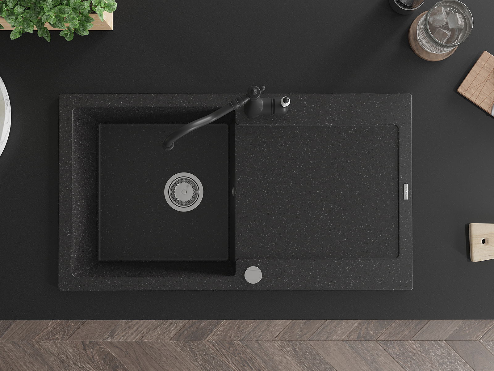 Mexen Leo 1 rekeszes gránit mosogató csepegtetővel és Carla konyhai csappal, fekete/ezüst metál - 6501-73-670700-70