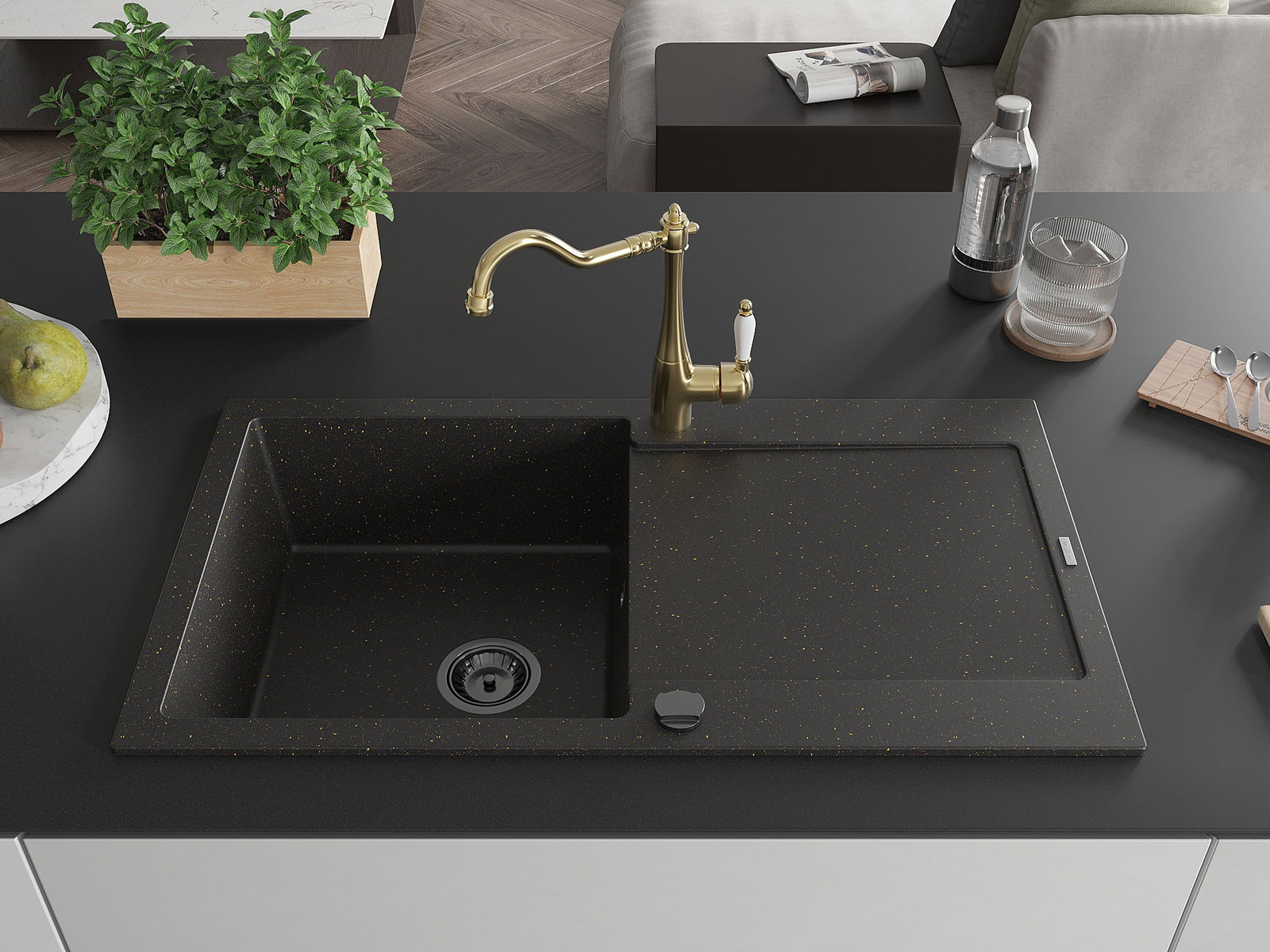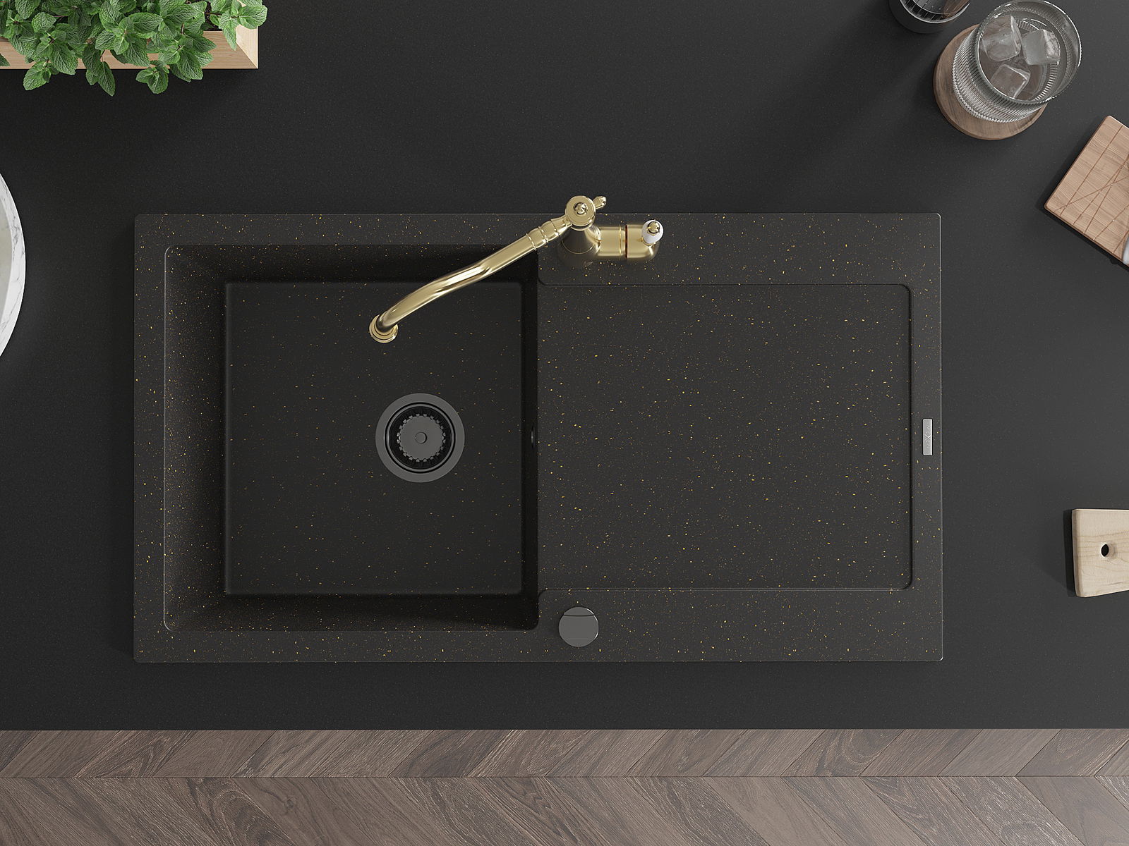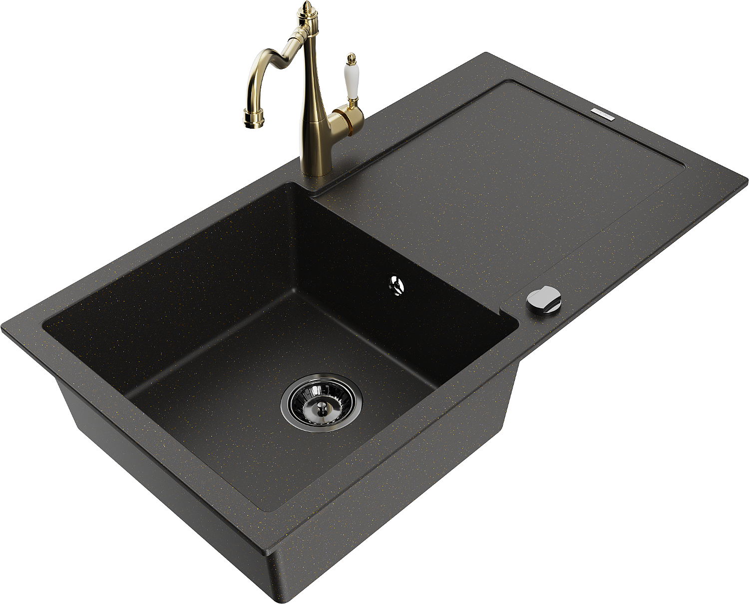 Mexen Leo egymedencés gránit mosogató csepegtetővel és Carla konyhai csapteleppel, fekete/arany metál - 6501-75-670700-50-B