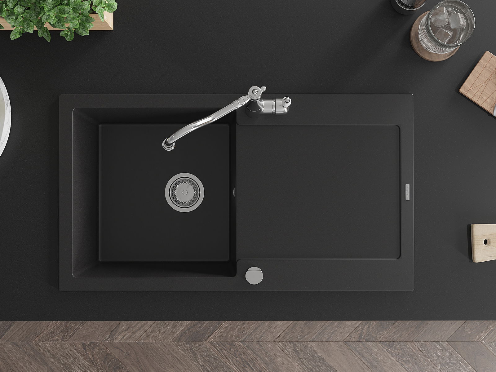 A mosogató kiváló minőségű gránitból készül. Ez egy elegáns és mindenekelőtt minden konyhához praktikus kiegészítés, stílusától függetlenül. A kiváló minőségű és a gránit tartósság biztosítja a sok éves használatát.