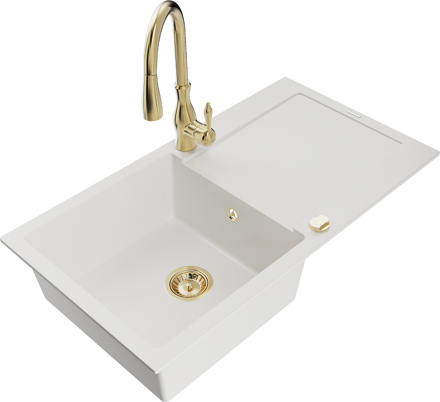 Mexen Leo gránit mosogató 1-medencés csepegtetővel és Savita konyhai csapteleppel, fehér - 6501-20-672601-50