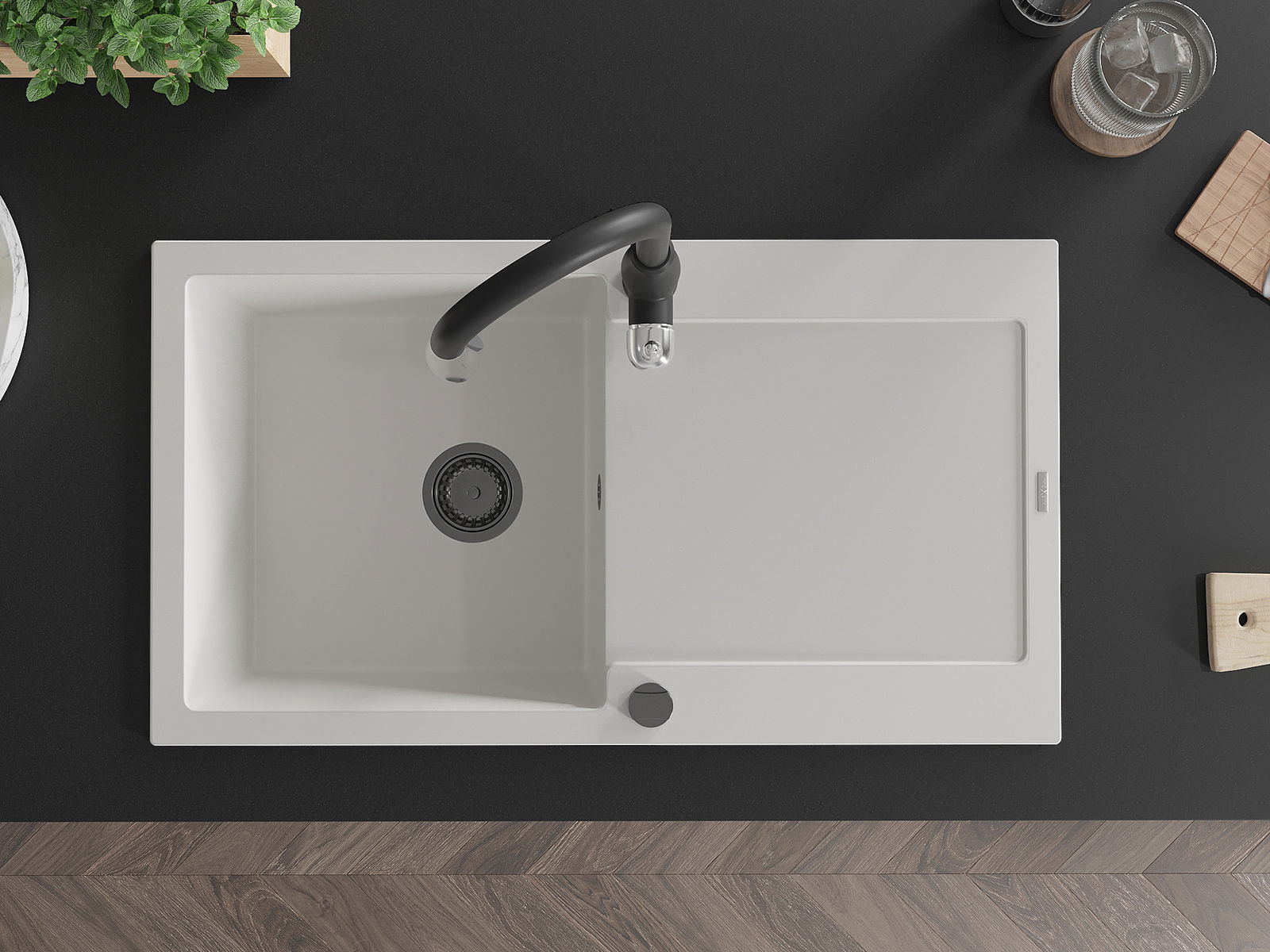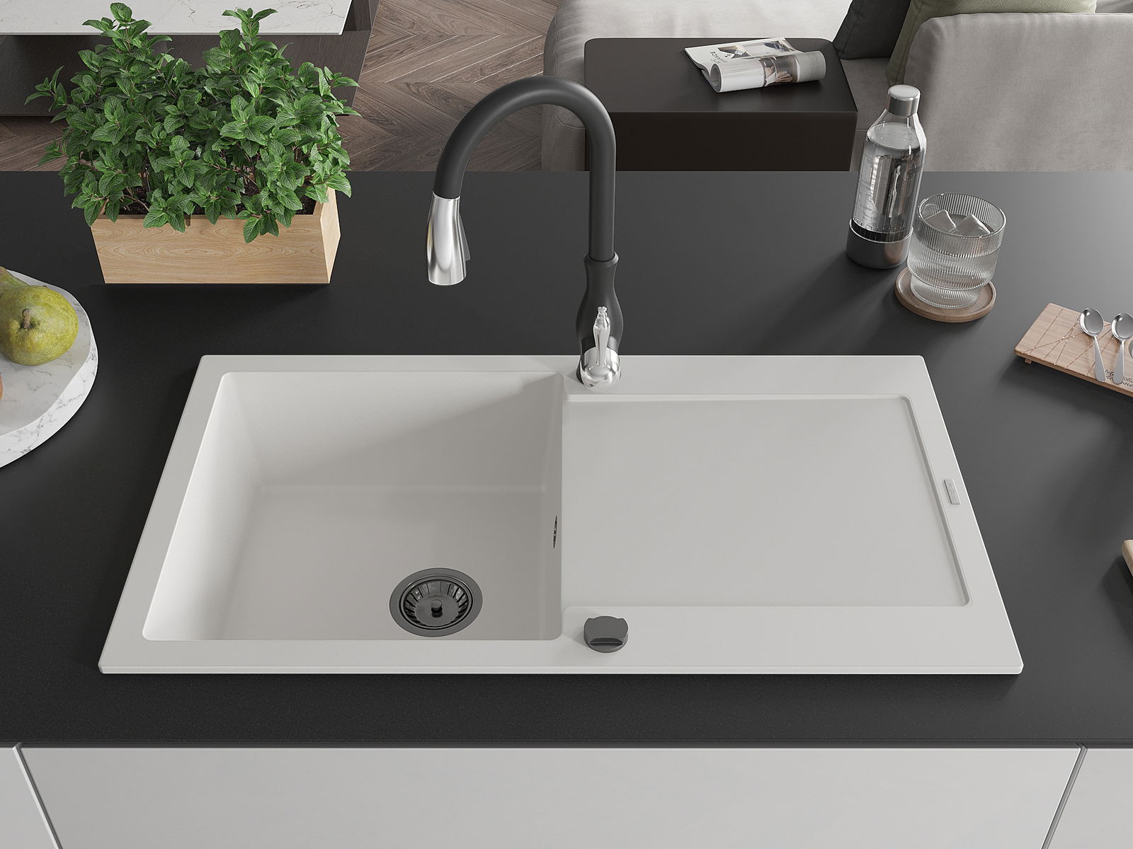 A mosogató magas minőségű gránitból készült. Elegáns, de mindenekelőtt praktikus kiegészítője minden konyhának, függetlenül annak stílusától. A gránit magas minősége és tartóssága hosszú távú használatot biztosít.