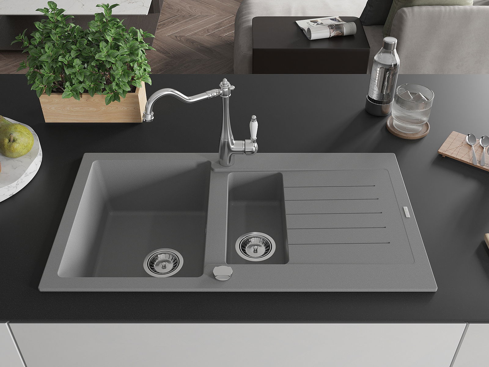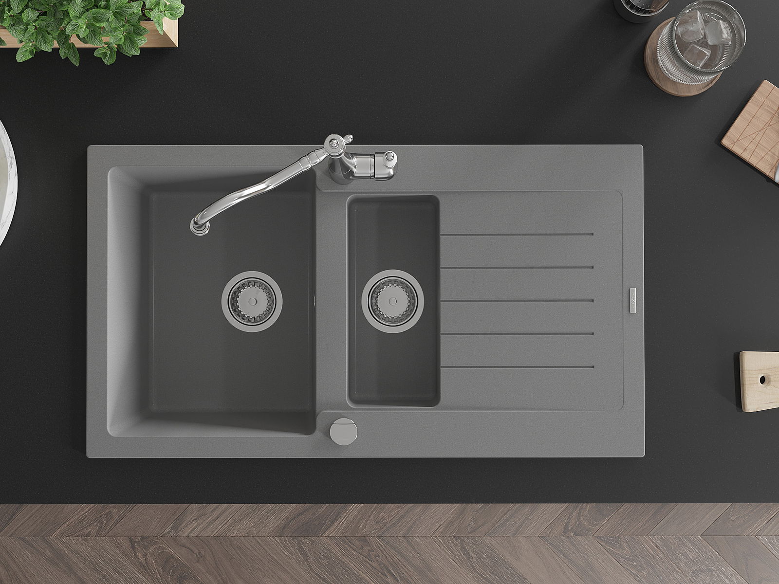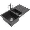 Mexen Matias gránit mosogató 1,5 rekeszes csepegtetővel és Carla konyhai csapteleppel, szürke - 6502-71-670700-00