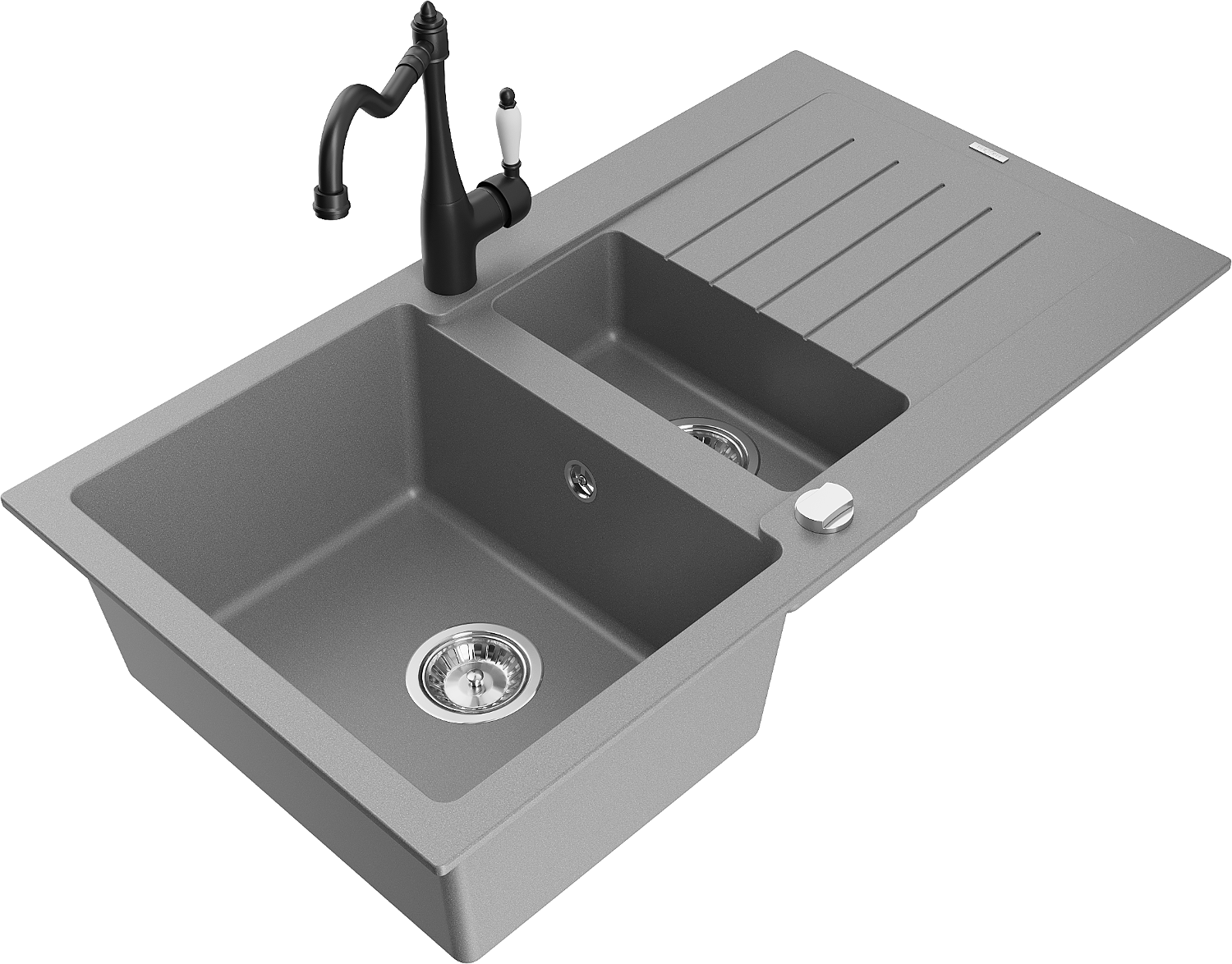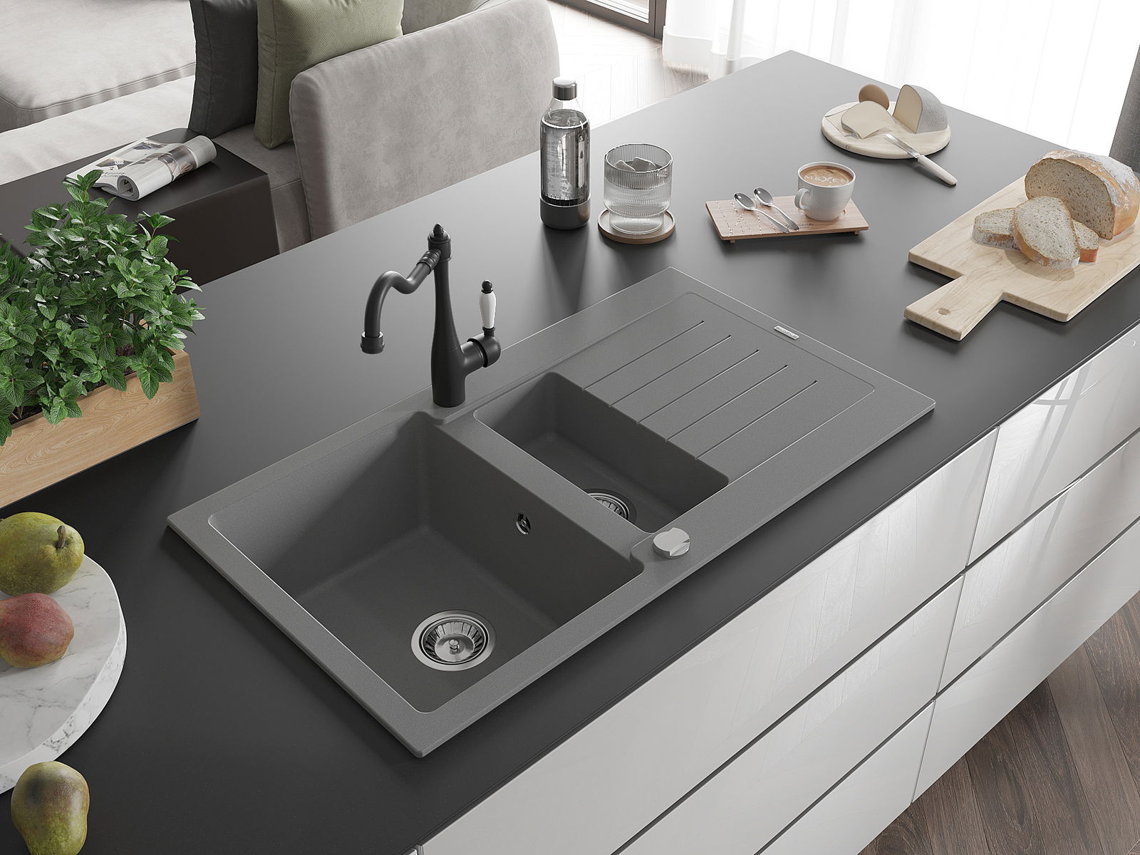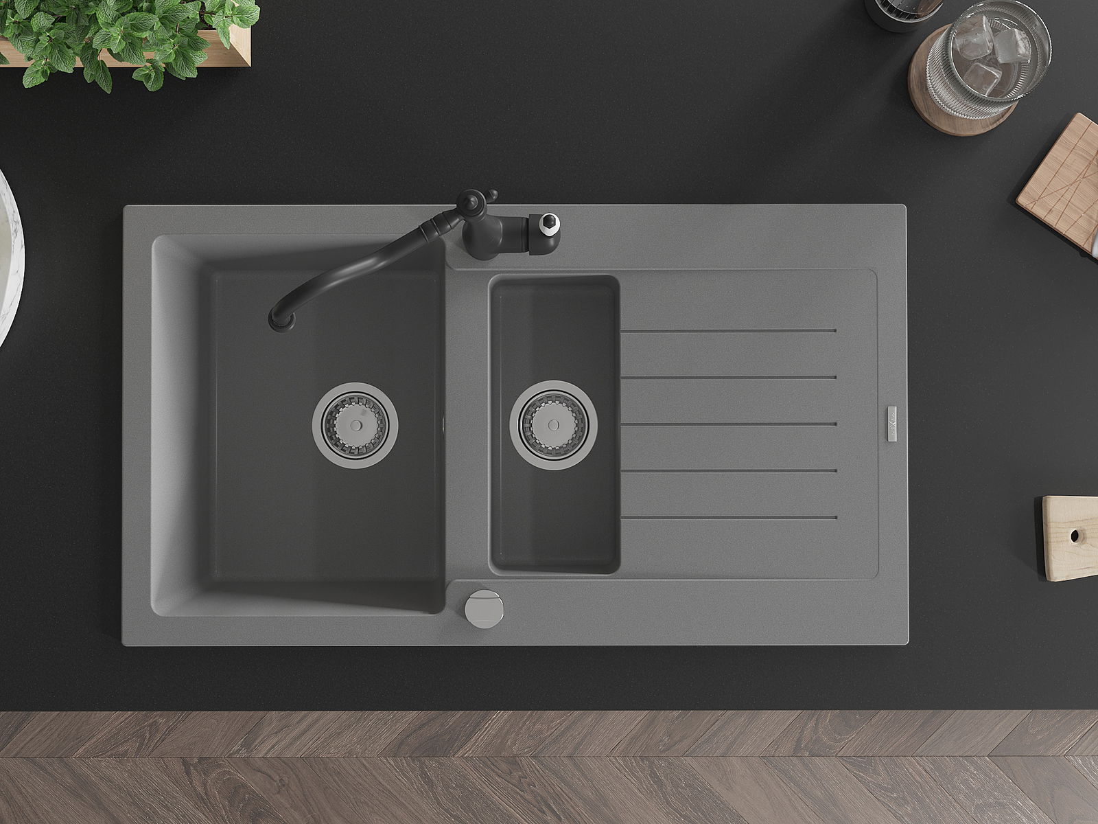 Mexen Matias gránit mosogató 1,5 medencés csepegtetővel és Carla konyhai csapteleppel, szürke - 6502-71-670700-70