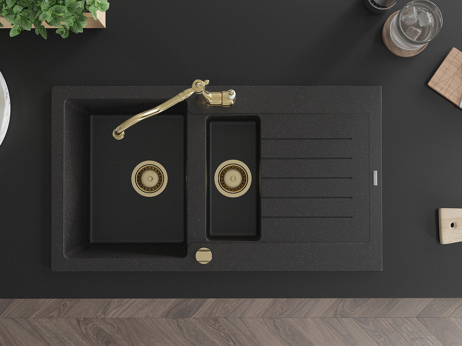 Mexen Matias gránit mosogató 1,5 rekeszes csepegtetővel és Carla konyhai csappal fekete/ezüst metál - 6502-73-670700-50