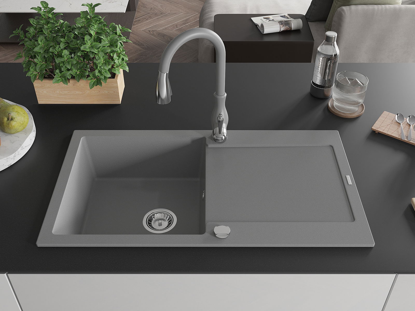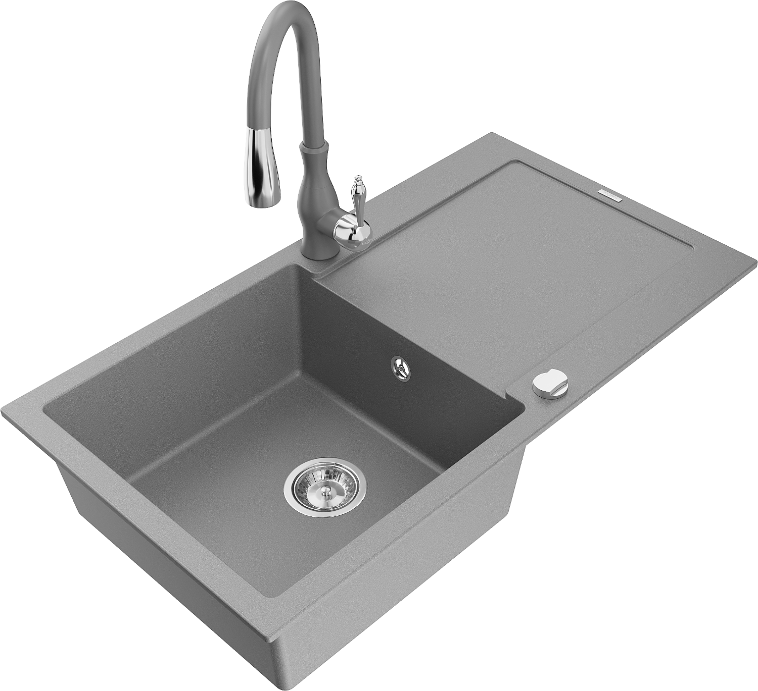 Mexen Leo egymedencés gránit mosogató csepegtetővel és Savita konyhai csapteleppel, szürke - 6501-71-672601-71