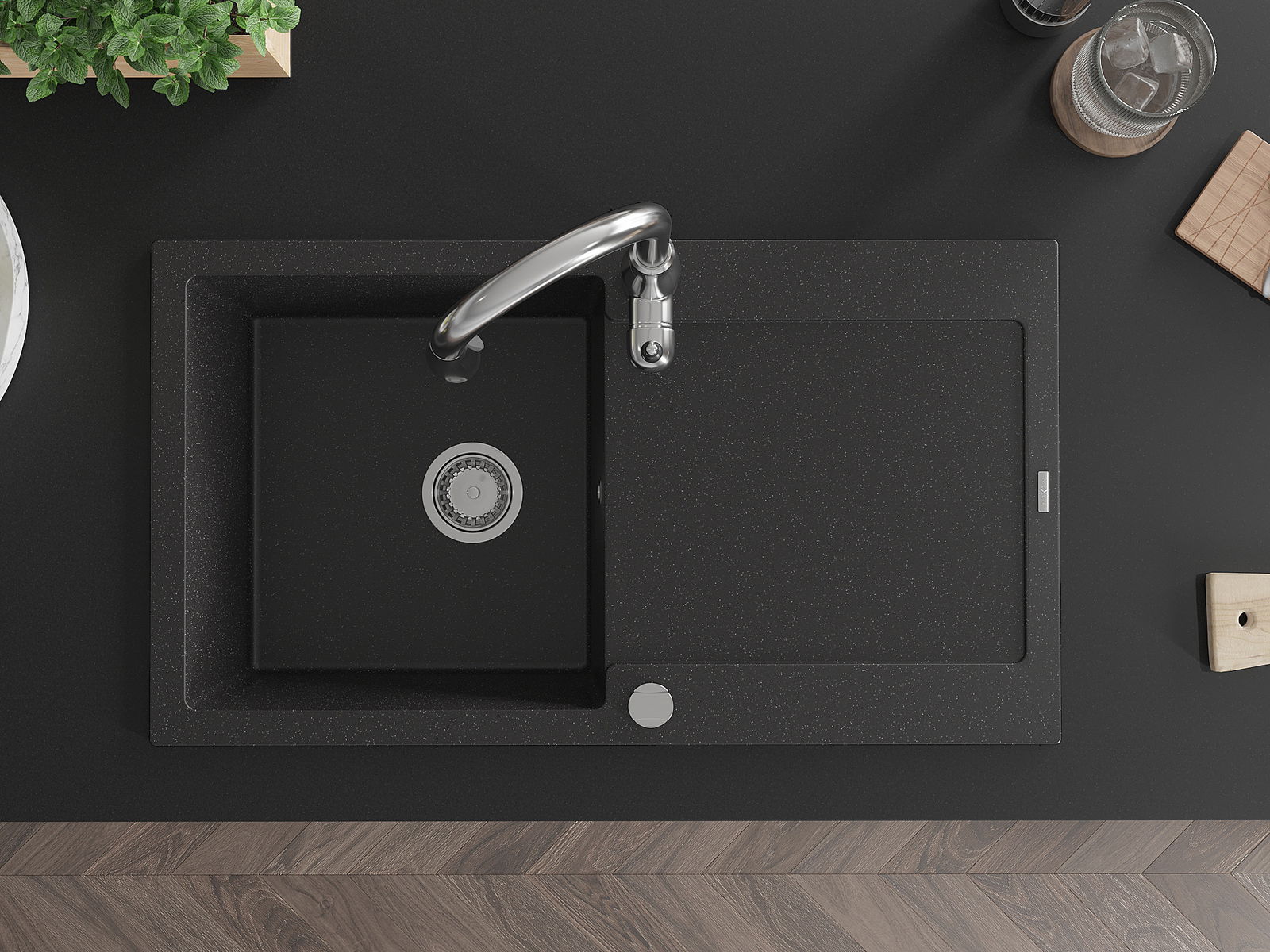A mosogató kiváló minőségű gránitból készül. Ez egy elegáns és mindenekelőtt minden konyhához praktikus kiegészítés, stílusától függetlenül. A kiváló minőségű és a gránit tartósság biztosítja a sok éves használatát.
