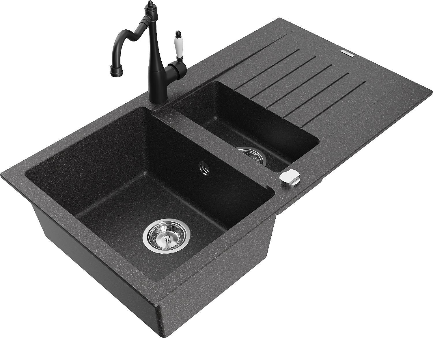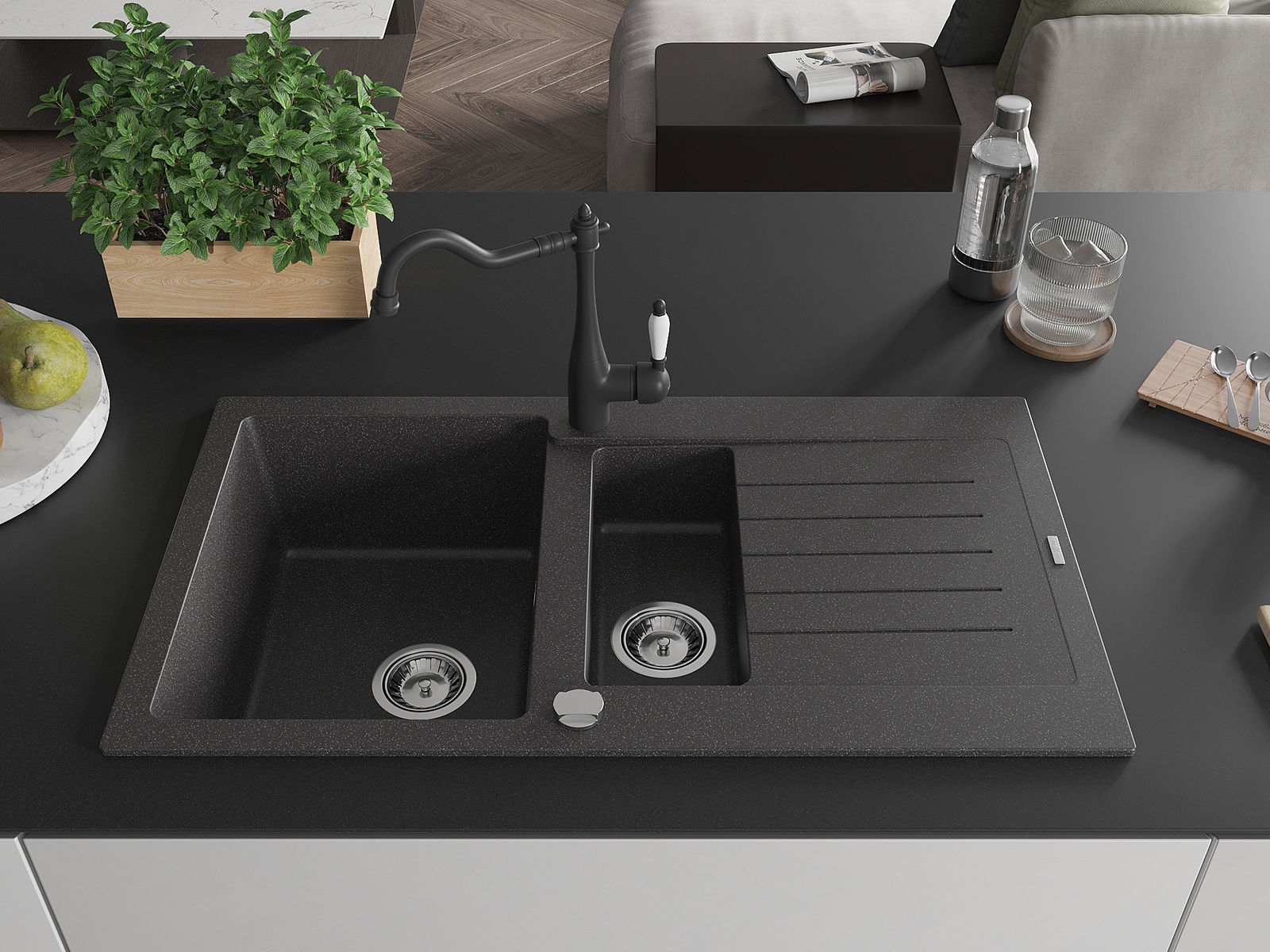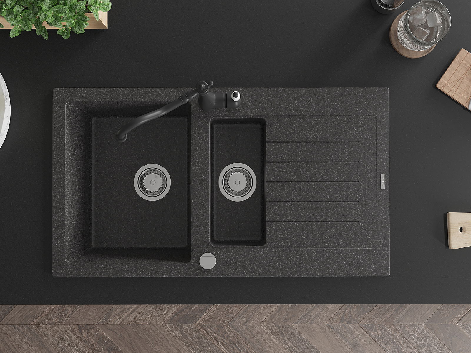 Mexen Matias gránit mosogató 1,5 rekeszes csepegtetővel és Carla konyhai csappal, fekete pettyes - 6502-76-670700-70