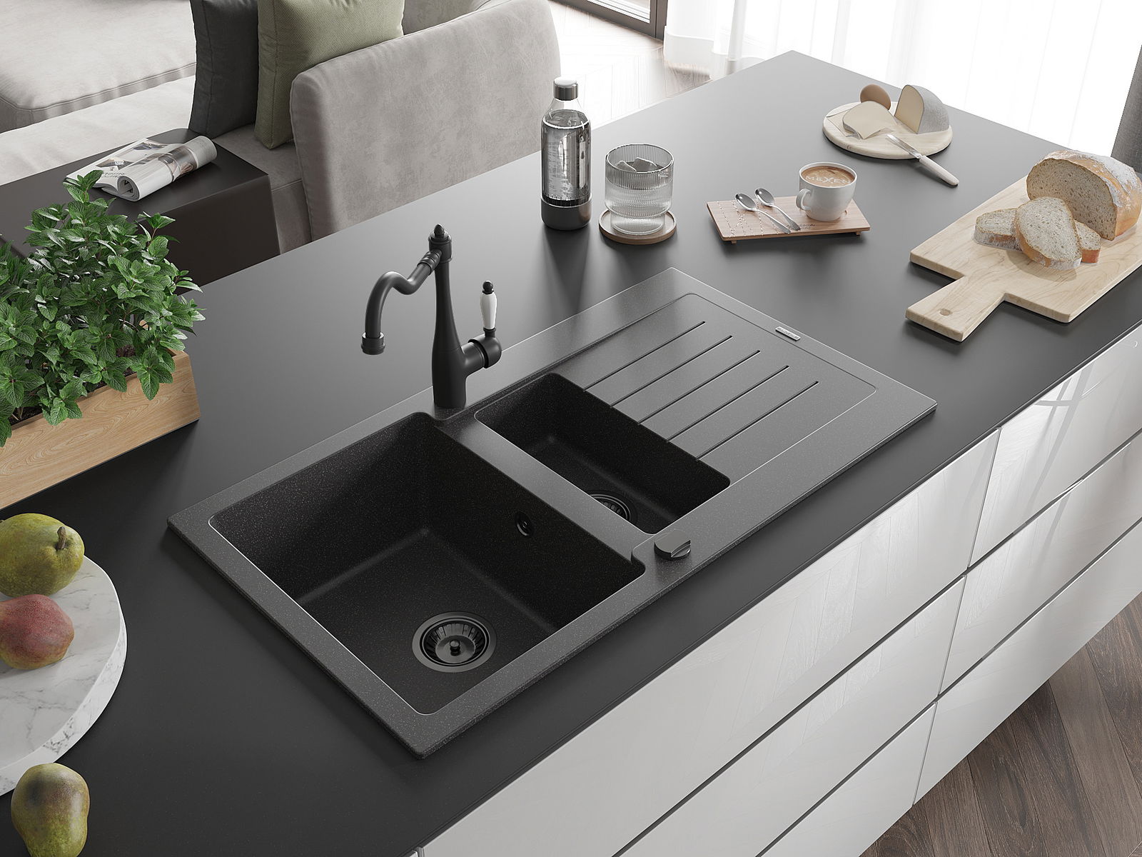 A mosogató kiváló minőségű gránitból készül. Ez egy elegáns és mindenekelőtt minden konyhához praktikus kiegészítés, stílusától függetlenül. A kiváló minőségű és a gránit tartósság biztosítja a sok éves használatát.