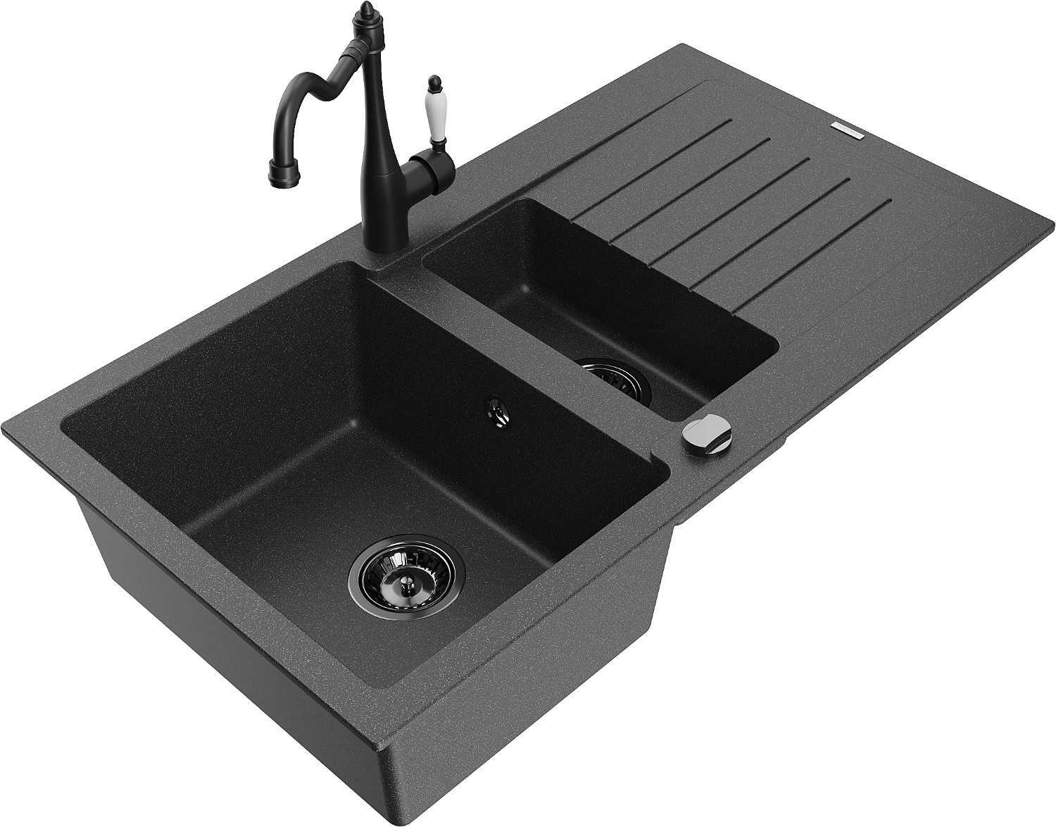Mexen Matias 1,5 rekeszes gránit mosogató csepptálcával és Carla konyhai csapteleppel, fekete tarkított - 6502-76-670700-70-B