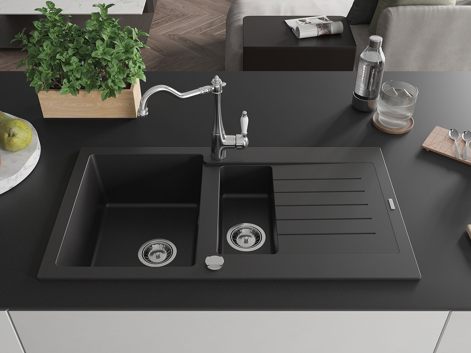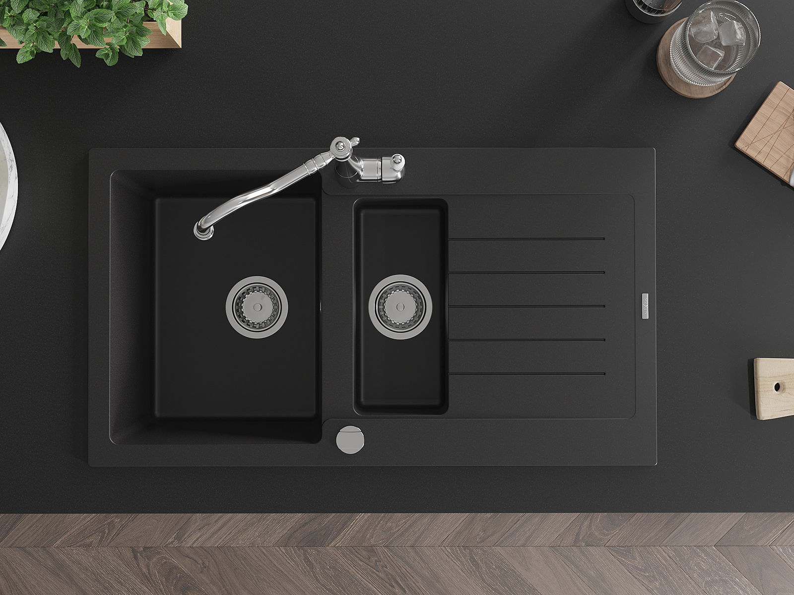 Mexen Matias 1,5 rekeszes gránit mosogató csepegtetővel és Carla konyhai csapteleppel, fekete - 6502-77-670700-00