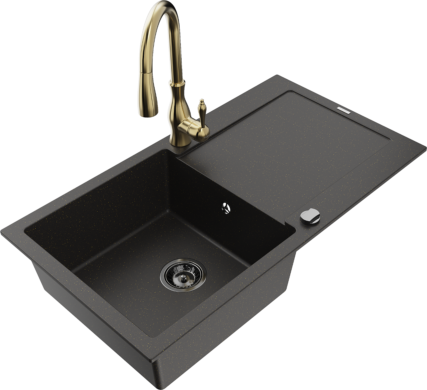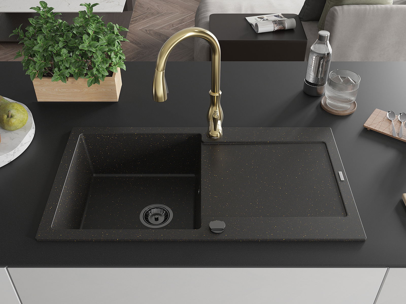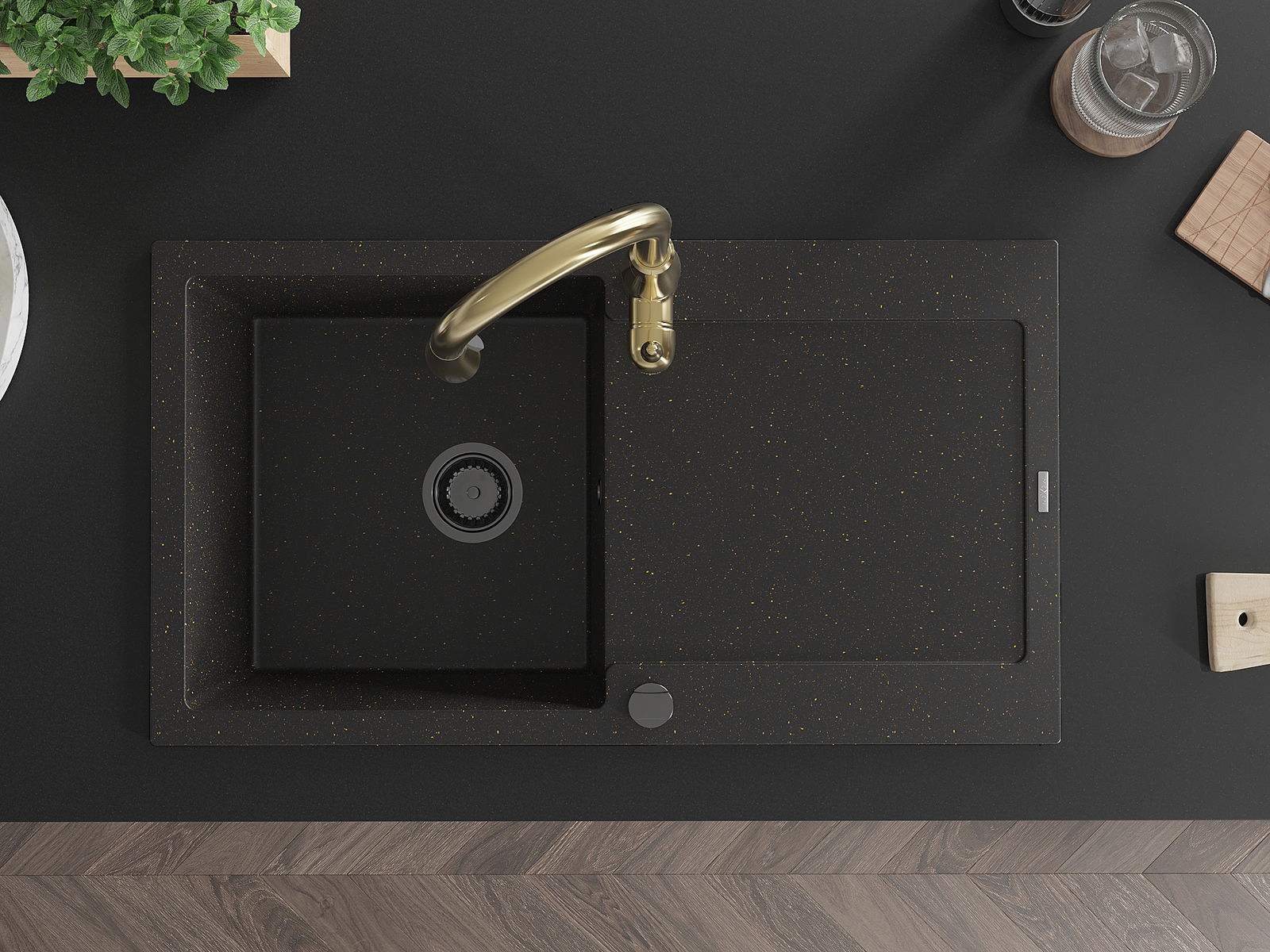 Mexen Leo Gránit 1-medencés mosogató csepegtetővel és Savita konyhai csapteleppel, fekete/arany metál