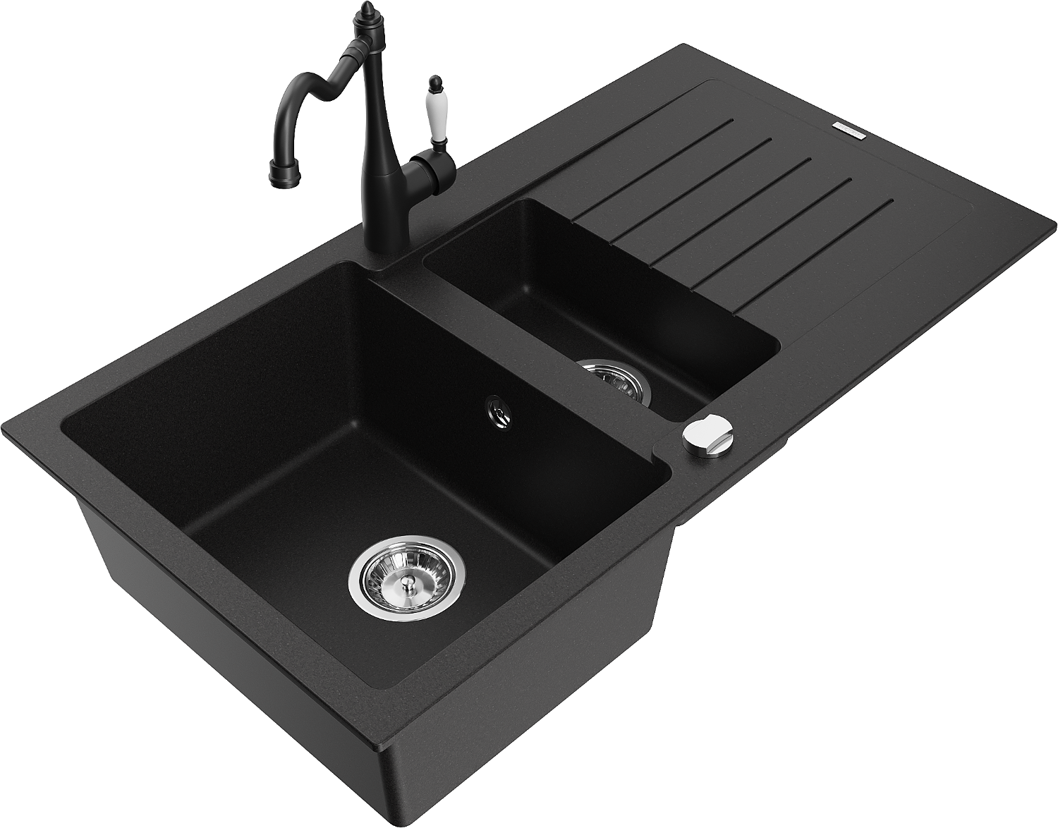 Mexen Matias gránit mosogató 1,5-medencés csepptálcával és Carla konyhai csapteleppel, fekete - 6502-77-670700-70