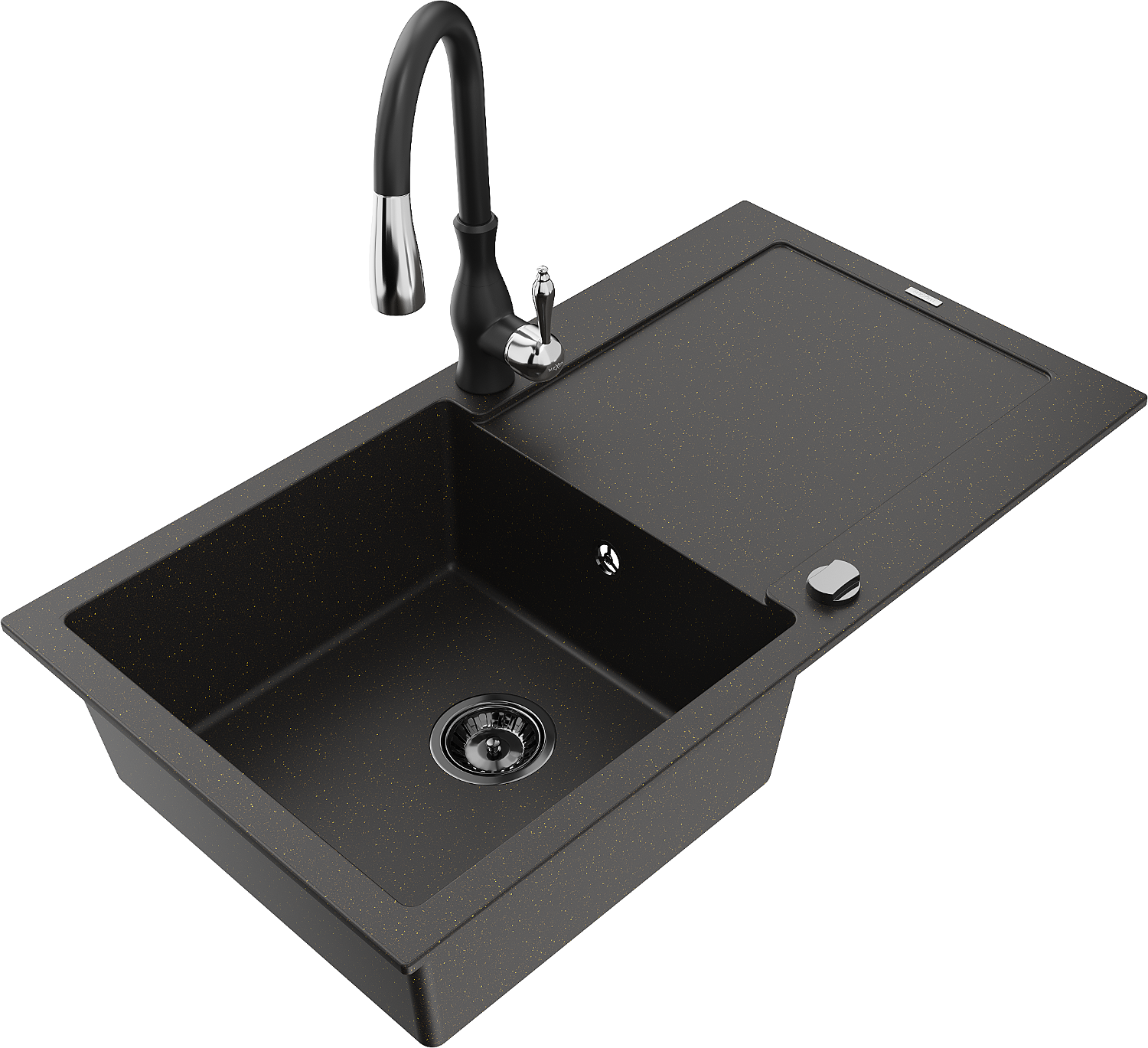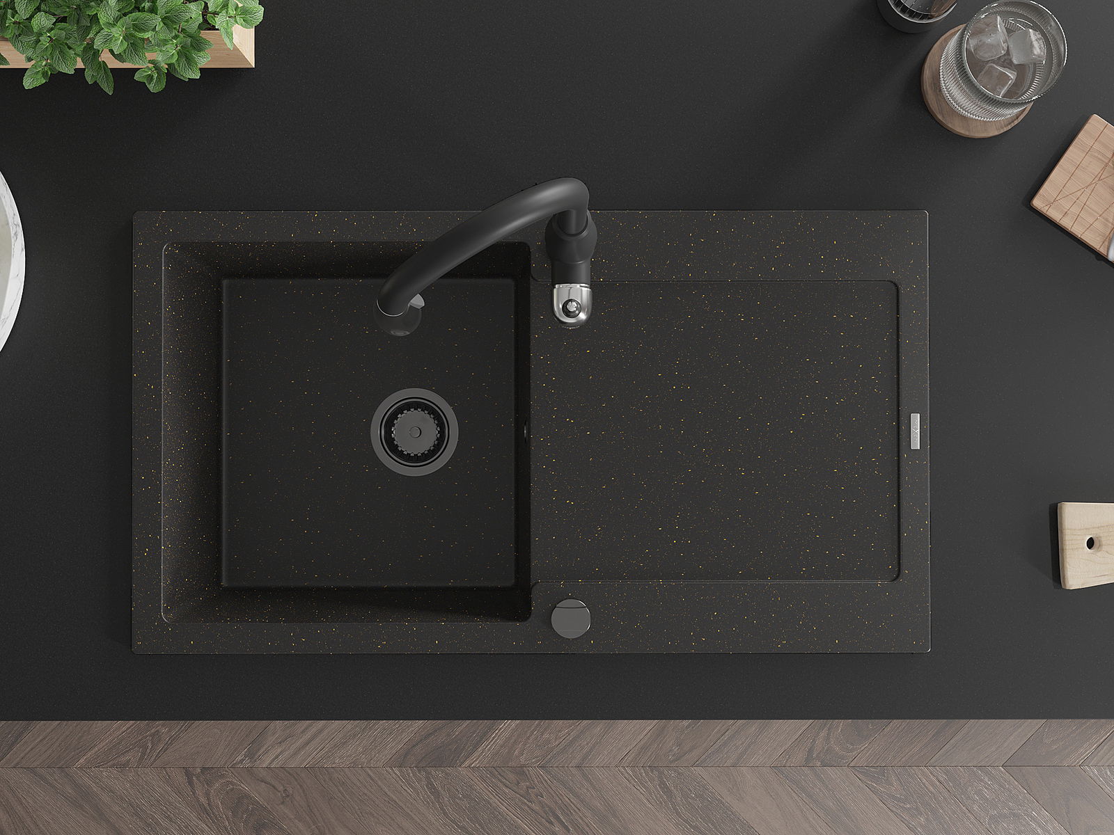 Mexen Leo egymedencés gránit mosogató, csepegtetővel és konyhai csappal, Savita, fekete/arany metálfényű