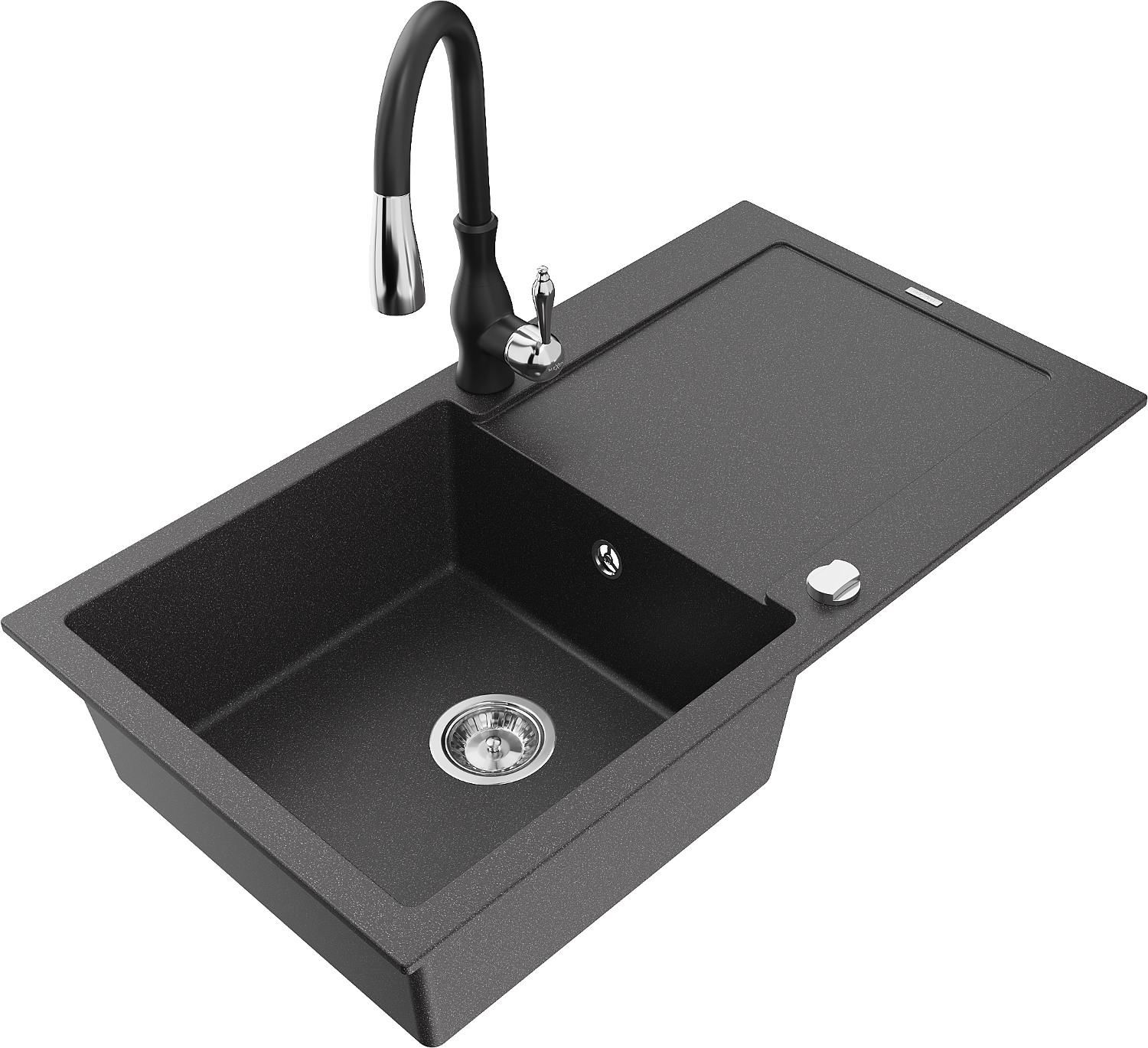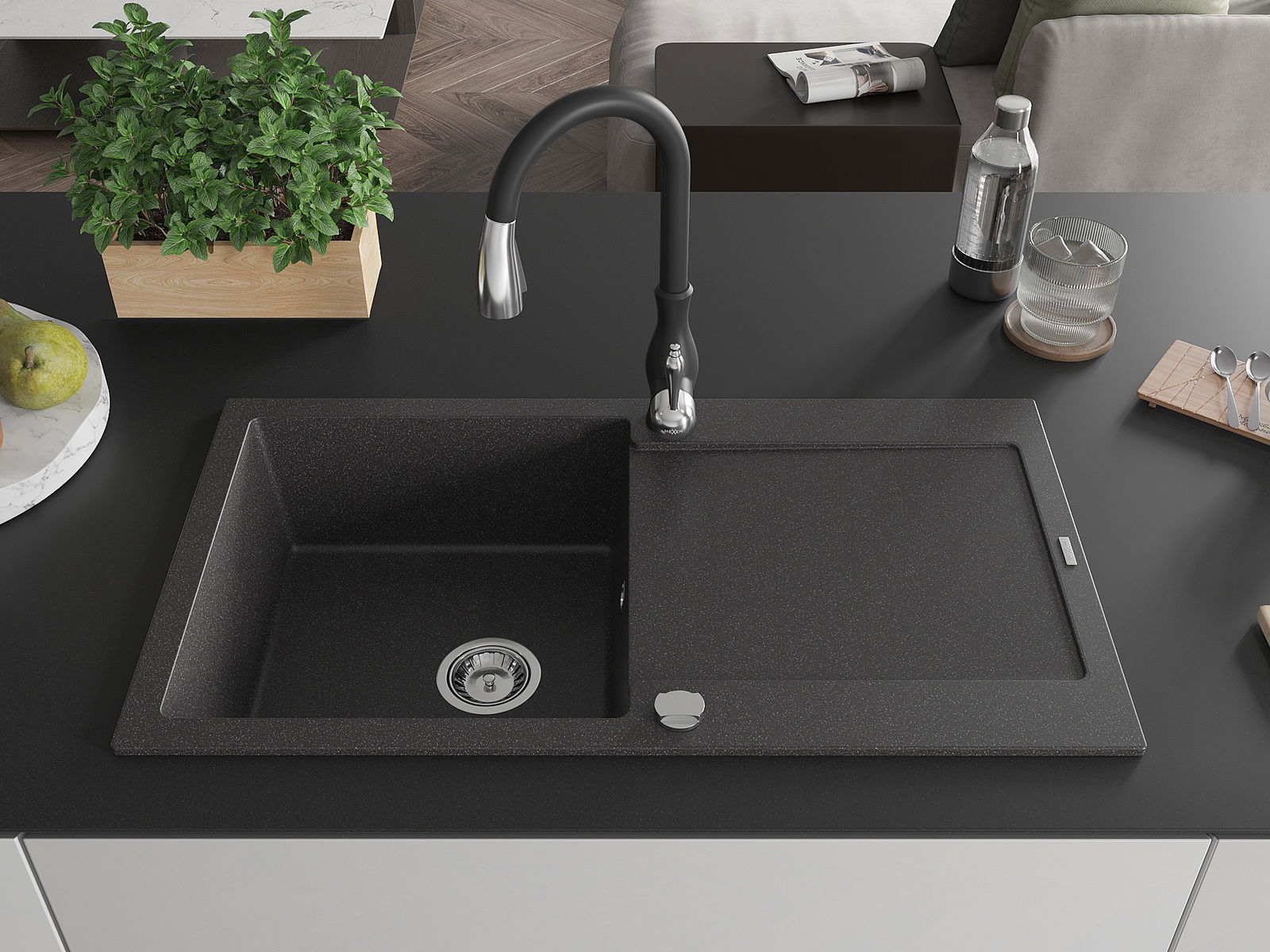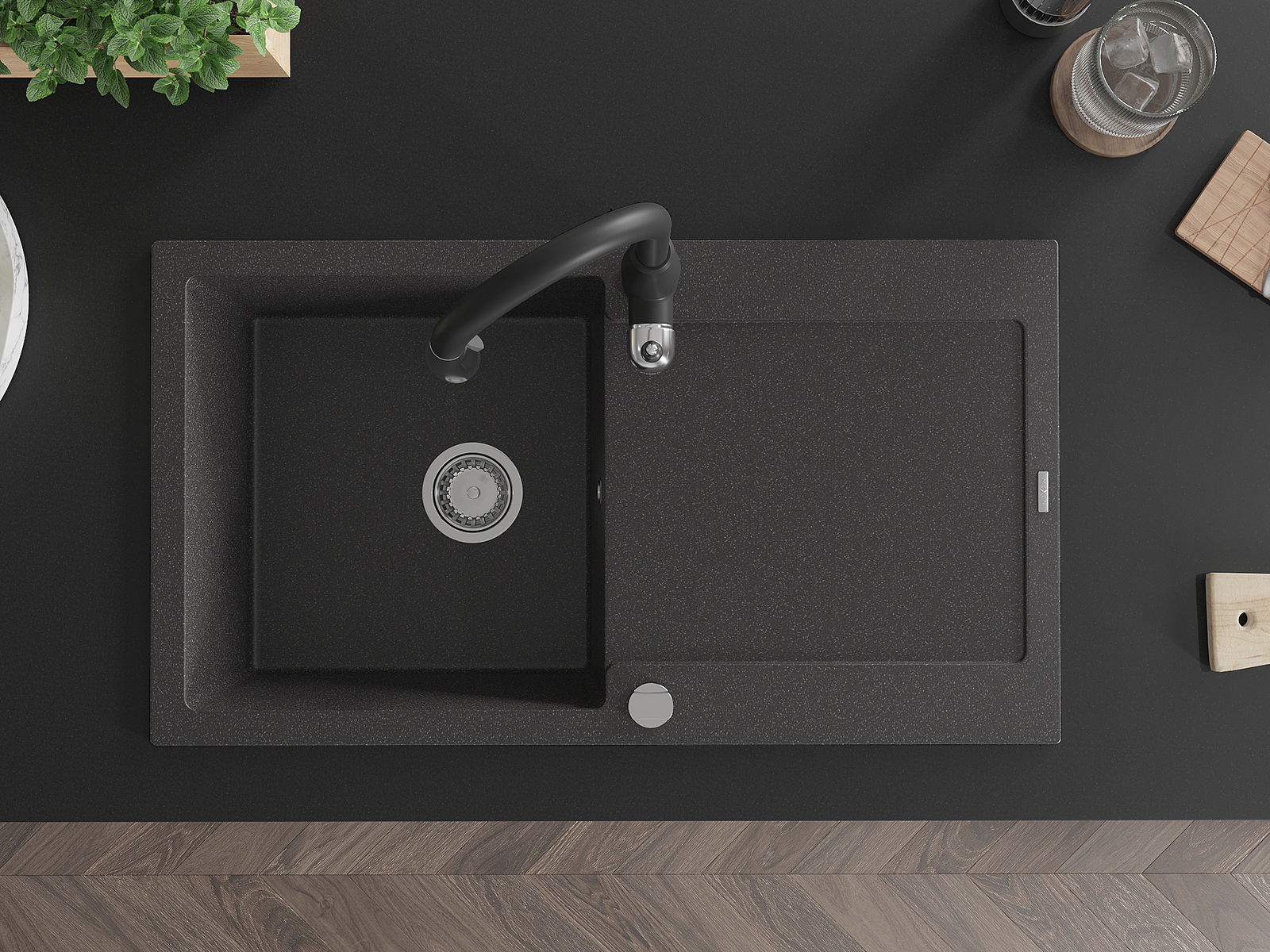 Mexen Leo egymedencés gránit mosogató csepegtetővel és Savita konyhai csapteleppel, fekete pettyes - 6501-76-672601-70